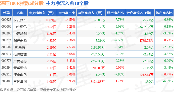 资金流向方面,深证100R(399004)指数成份股当日主力资金净流出合计36.16亿元,游资资金净流出合计3833.75万元,散户资金净流入合计36.55亿元。成份股资金流向详情见下表: