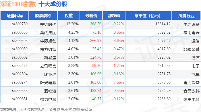 深证100R(399004)指数十大成份股详情如下: