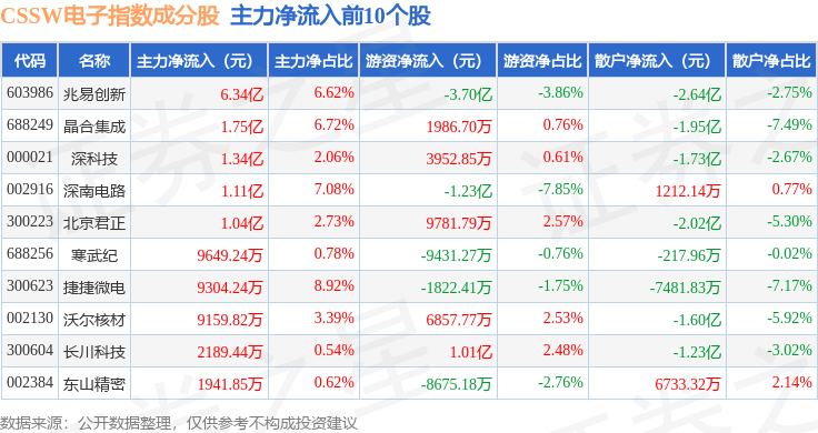 资金流向方面,CSSW电子(399811)指数成份股当日主力资金净流出合计38.09亿元,游资资金净流入合计20.9亿元,散户资金净流入合计17.19亿元。成份股资金流向详情见下表: