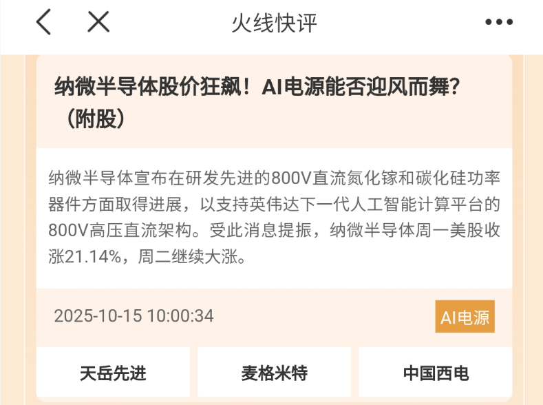 在10月15日,火线快评提到了AI电源板块,相关公司麦格米特、中国西电股价上扬。