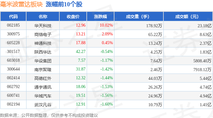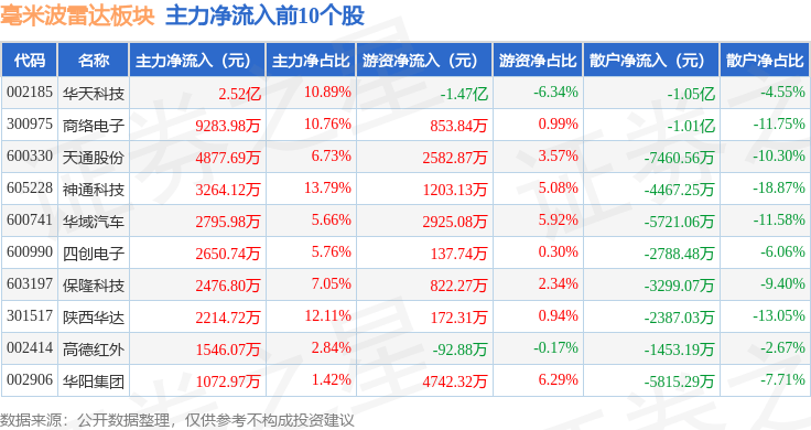 从资金流向上来看,当日毫米波雷达板块主力资金净流出52.51亿元,游资资金净流入17.14亿元,散户资金净流入35.37亿元。毫米波雷达板块个股资金流向见下表:
