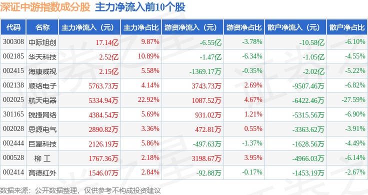 资金流向方面,深证中游(399705)指数成份股当日主力资金净流出合计258.51亿元,游资资金净流入合计65.38亿元,散户资金净流入合计193.13亿元。成份股资金流向详情见下表: