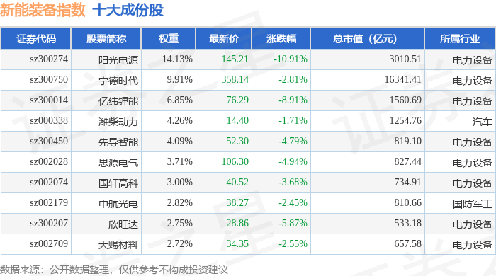 新能装备(970043)指数十大成份股详情如下: