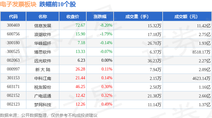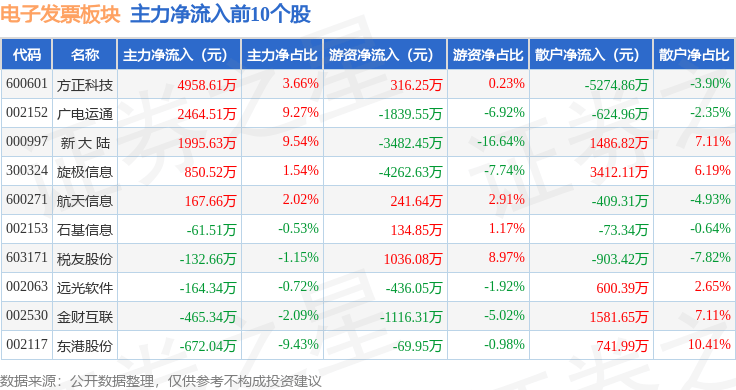 从资金流向上来看,当日电子发票板块主力资金净流出7451.38万元,游资资金净流出2050.87万元,散户资金净流入9502.25万元。电子发票板块个股资金流向见下表: