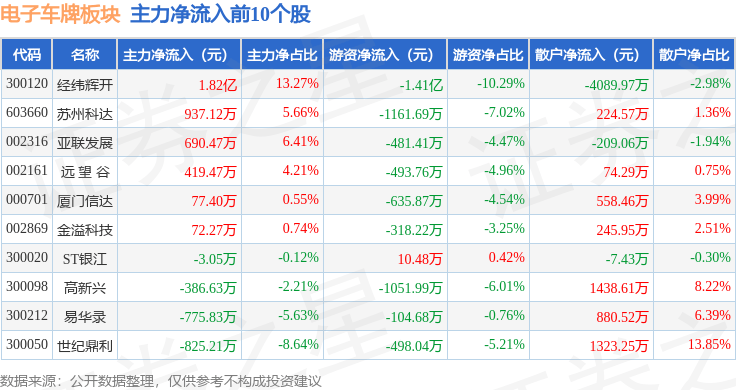 从资金流向上来看,当日电子车牌板块主力资金净流入8895.45万元,游资资金净流出1.63亿元,散户资金净流入7367.73万元。电子车牌板块个股资金流向见下表: