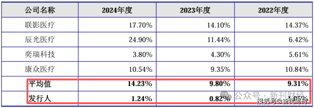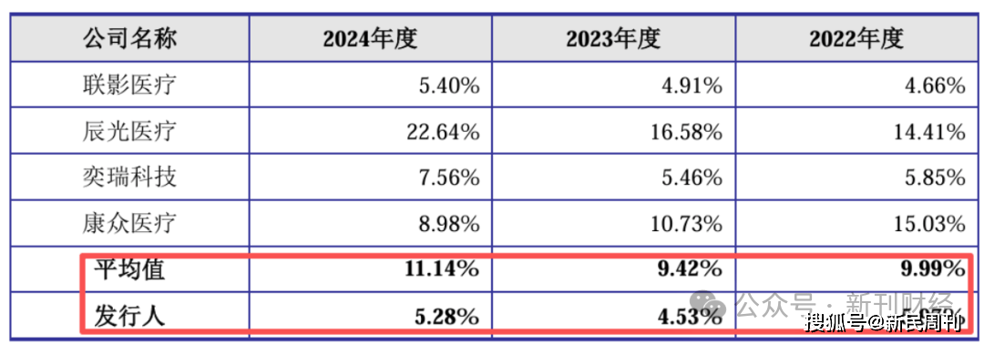 报告期公司研发费用一直徘徊在6%左右,而四家同行业上市公司同期除辰光医疗2022年研发费用率在6.43%之外,其余年份都是在10%以上,辰光医疗2024年研发费用率就飙升到24.74%的超高水平。研发费用率低,说明公司在研发上投入不足,公司产品竞争力弱,直接体现就是毛利率水平低于同行业上市企业,如下表所示: