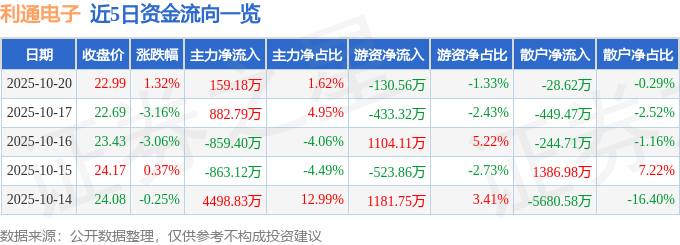 证券之星消息,截至2025年10月20日收盘,利通电子(603629)报收于22.99元,上涨1.32%,换手率1.66%,成交量4.27万手,成交额9837.29万元。