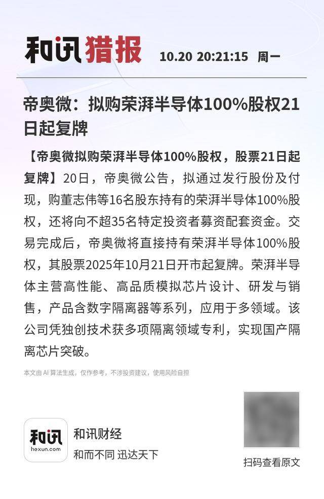 【帝奥微拟购荣湃半导体100%股权,股票21日起复牌】20日,帝奥微公告,拟通过发行股份及付现,购董志伟等16名股东持有的荣湃半导体100%股权,还将向不超35名特定投资者募资配套资金。交易完成后,帝奥微将直接持有荣湃半导体100%股权,其股票2025年10月21日开市起复牌。荣湃半导体主营高性能、高品质模拟芯片设计、研发与销售,产品含数字隔离器等系列,应用于多领域。该公司凭独创技术获多项隔离领域专利,实现国产隔离芯片突破。