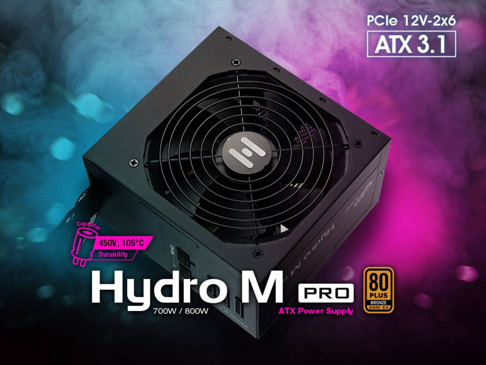 新款Hydro M PRO(ATX3.1)延续了此前的功率配置,提供700W与800W两种型号选择。产品保持标准ATX外形尺寸,长度为140mm,内部采用450V耐压、105°C耐温的电容元件,电源结构为单路+12V输出设计,搭配DC-DC转换拓扑,确保输出稳定。