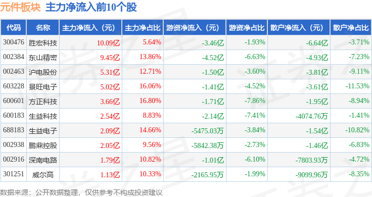 从资金流向上来看,当日元件板块主力资金净流入43.96亿元,游资资金净流出21.28亿元,散户资金净流出22.68亿元。元件板块个股资金流向见下表: