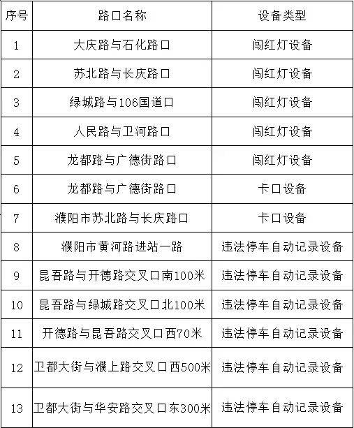 为进一步规范我市道路通行秩序,预防和减少道路交通事故,保障人民群众生命财产安全,濮阳市公安局交通警察支队在大庆路与石化路交叉口等13处规划安装了交通技术监控设备,经备案审核,将于2025年11月1日起正式启用。