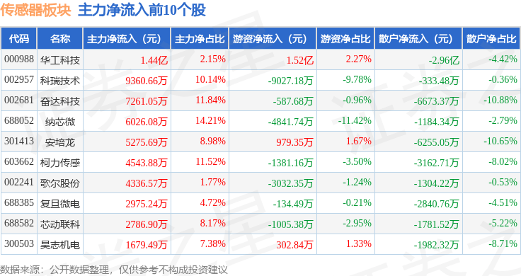 从资金流向上来看,当日传感器板块主力资金净流出26.44亿元,游资资金净流入10.45亿元,散户资金净流入15.99亿元。传感器板块个股资金流向见下表: