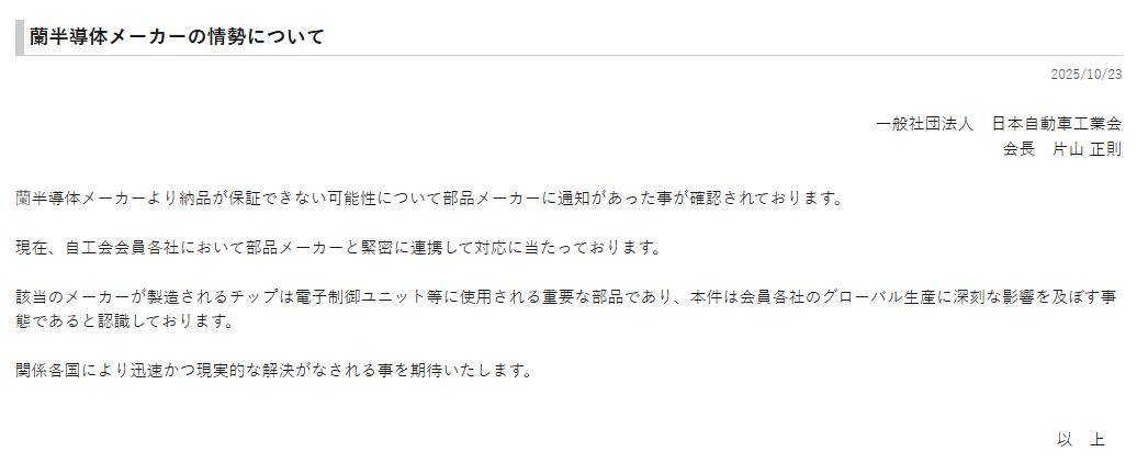 IT之家 10 月 23 日消息,日本汽车工业协会今日发布公告,经确认,已收到零部件厂商发来的通知,来自荷兰半导体制造商的产品存在无法保证交付的可能性。