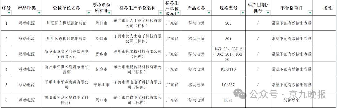 (一)移动电源。共抽查53批次产品,其中在周口市、漯河市、新乡市、济源示范区等15个地市31家销售单位抽查40批次产品,在淘宝、拼多多、1688、天猫等4家平台12家销售单位抽查13批次产品,抽查发现6批次产品不合格。其中,有1批次产品安全项目转换效率不合格;有5批次产品常温下的有效输出容量不合格。