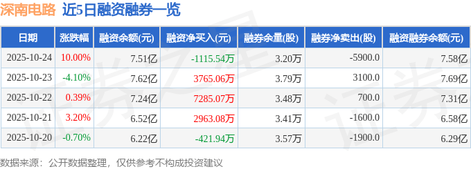 深南电路融资融券信息显示,融资方面,当日融资买入1.95亿元,融资偿还2.06亿元,融资净偿还1115.54万元。融券方面,融券卖出900.0股,融券偿还6800.0股,融券余量3.2万股,融券余额682.5万元。融资融券余额7.58亿元。