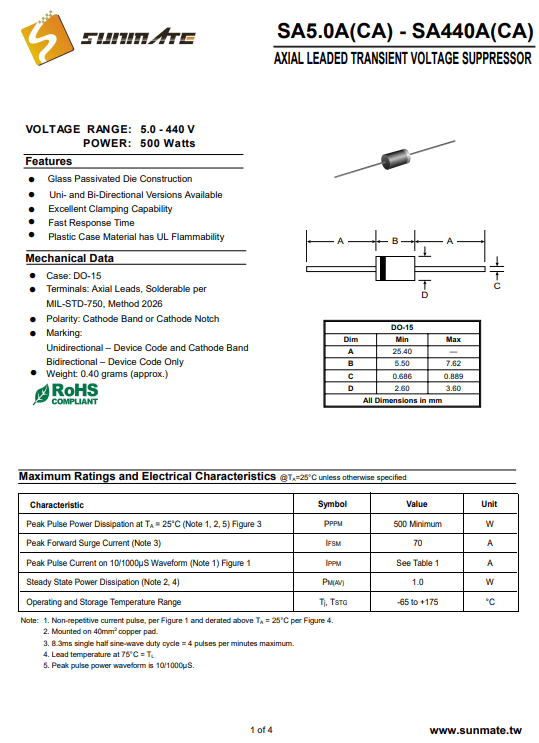 500W峰值脉冲功率能力,a10/10004波,重复率(dutycycle):0.01%高温焊接保证:260*C/10秒