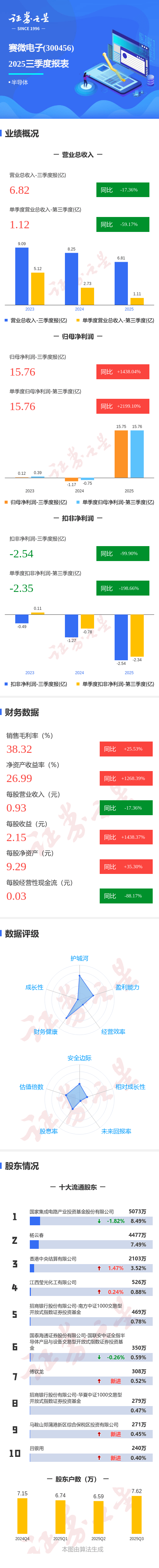 证券之星消息,赛微电子2025年三季报显示,公司主营收入6.82亿元,同比下降17.37%;归母净利润15.76亿元,同比上升1438.05%;扣非净利润-2.54亿元,同比下降99.9%;其中2025年第三季度,公司单季度主营收入1.12亿元,同比下降59.17%;单季度归母净利润15.76亿元,同比上升2199.1%;单季度扣非净利润-2.35亿元,同比下降198.67%;负债率20.24%,投资收益22.02亿元,财务费用4794.97万元,毛利率38.32%。