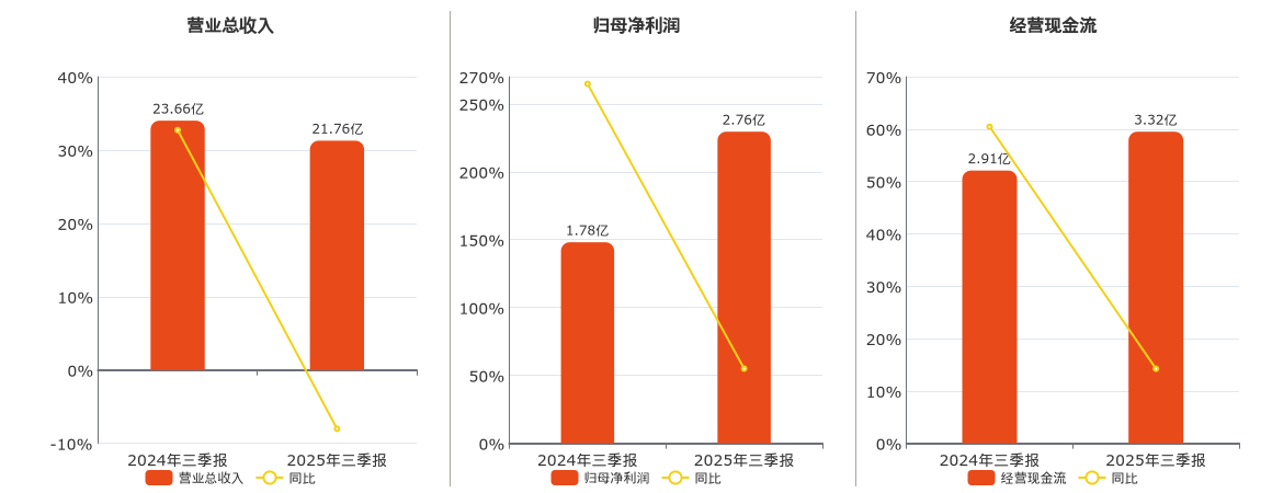 公司营业总收入为21.76亿元,较去年同报告期营业总收入减少1.90亿元,同比较去年同期下降8.02%。归母净利润为2.76亿元。经营活动现金净流入为3.32亿元。
