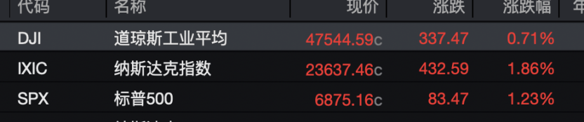 当地时间周一,美股三大指数集体收涨,且均收于历史新高。截至收盘,道琼斯指数涨0.71%,报47544.59点;标普500指数涨1.23%,报6875.16点;纳斯达克综合指数涨1.86%,报23637.46点,均刷新了上周五录得的历史纪录。