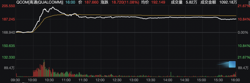 受此消息刺激,高通股价周一开盘后直线拉涨,日内涨幅一度超过20%。截至收盘,涨幅收窄至约11%。