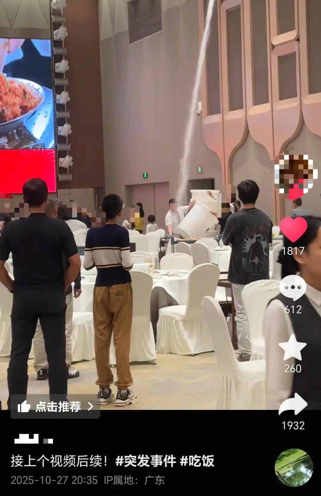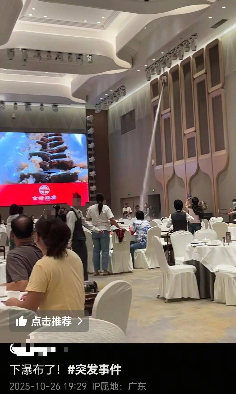 视频画面中,水柱从宴会厅的墙壁上方发出,直直地淋在用餐区。附近的客人已经疏散开,几位工作人员忙着搬来大桶接水。