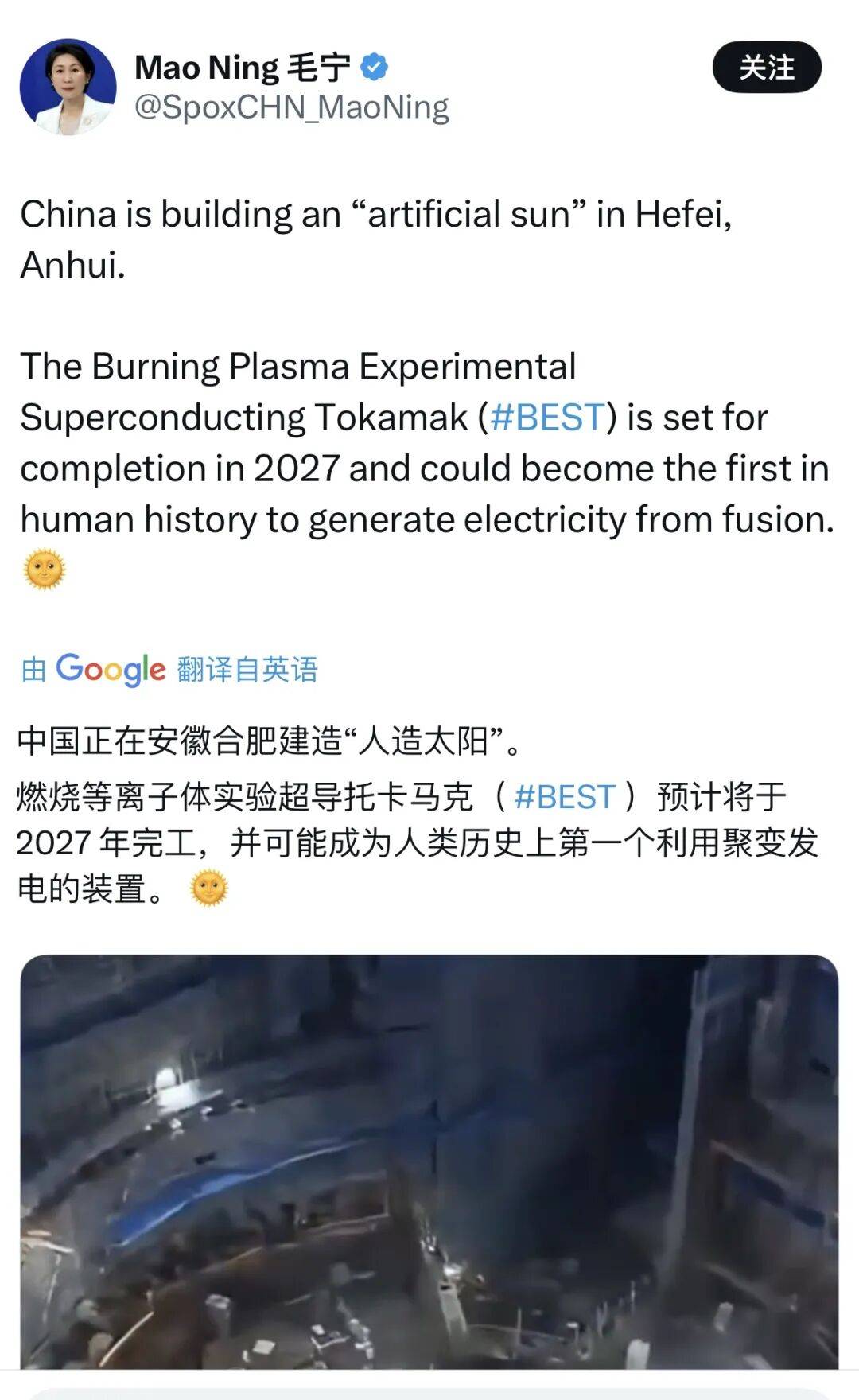近期,我国可控核聚变及超导领域接连取得多个新进展。10月25日,外交部发言人、新闻司司长毛宁在海外社交平台上向世界分享位于合肥的“人造太阳”(BEST)的最新进展,该装置预计2027年完工。据合肥发布介绍,紧凑型聚变能实验装置(BEST),以全超导托卡马克技术为基础,计划首次实现聚变能发电的演示。作为全超导托卡马克核聚变实验装置(EAST,俗称“人造太阳”)的后续项目,BEST将在EAST的基础上进一步提升核聚变能源的经济性和可行性。