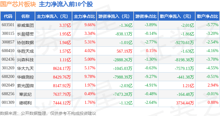 从资金流向上来看,当日国产芯片板块主力资金净流出155.82亿元,游资资金净流入48.19亿元,散户资金净流入107.63亿元。国产芯片板块个股资金流向见下表: