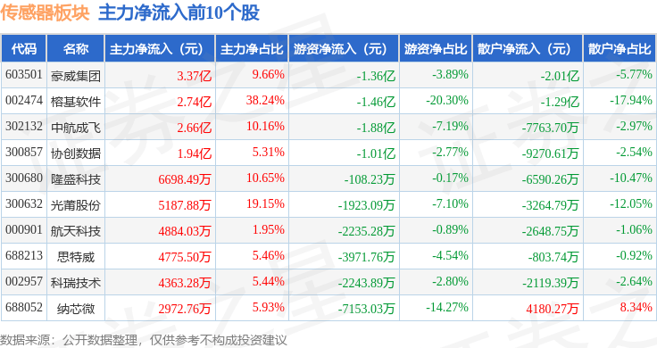从资金流向上来看,当日传感器板块主力资金净流出30.44亿元,游资资金净流入1.62亿元,散户资金净流入28.81亿元。传感器板块个股资金流向见下表: