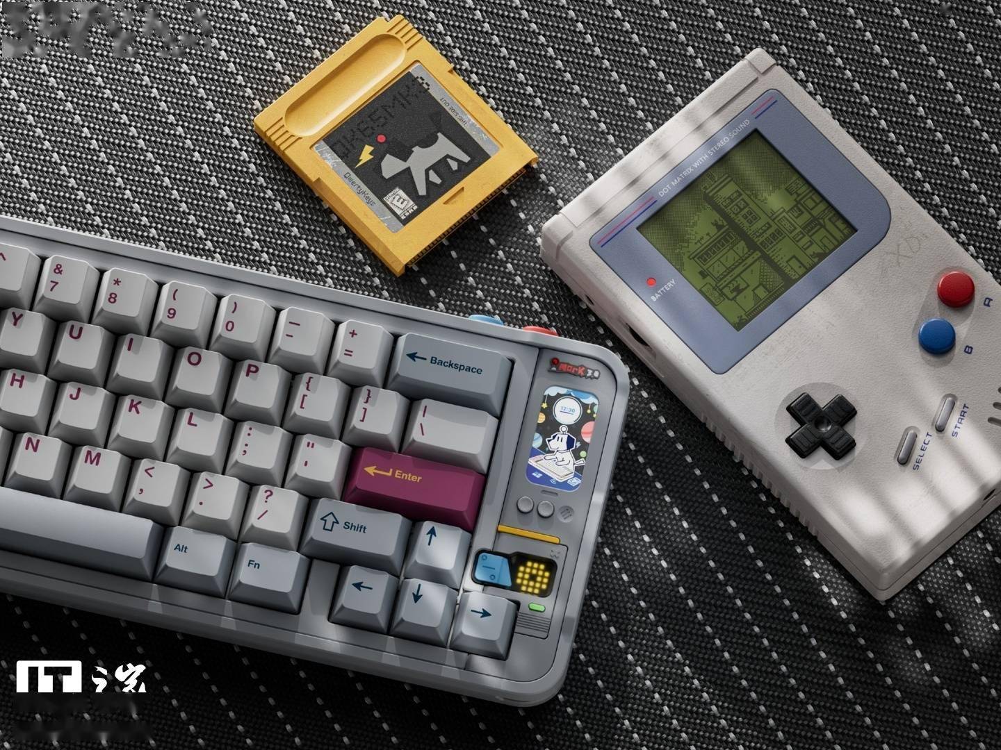 外观方面,这款键盘的外观设计灵感源自 20 世纪 90 年代的经典游戏机,如 SNES(IT之家注:超任)、GameBoy 等,采用复古的灰色搭配淡紫色,屏幕位于键盘右侧,下方拥有两枚小按键和一枚扬声器,可用于操作游戏和播放内部音效,让玩家直接在键盘上就能养电子宠物,还能玩到类似金山打字通“生死时速”的小游戏。