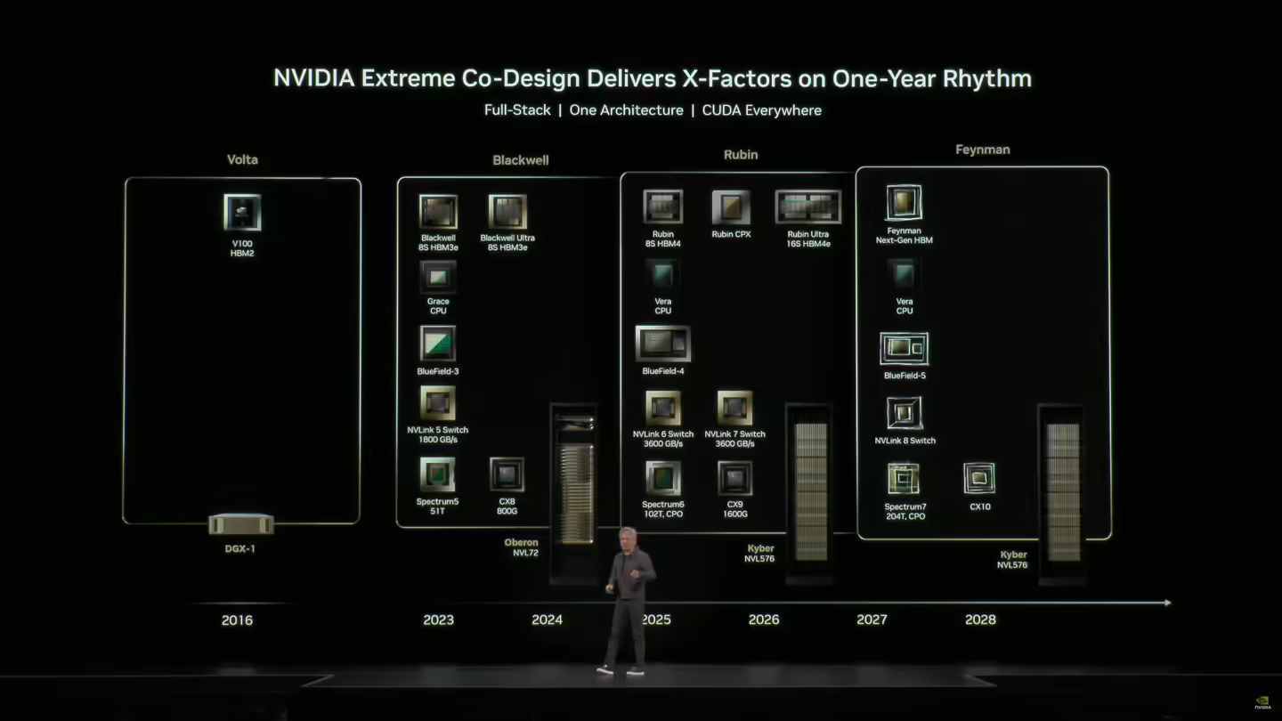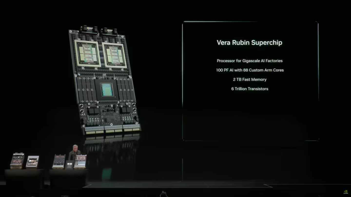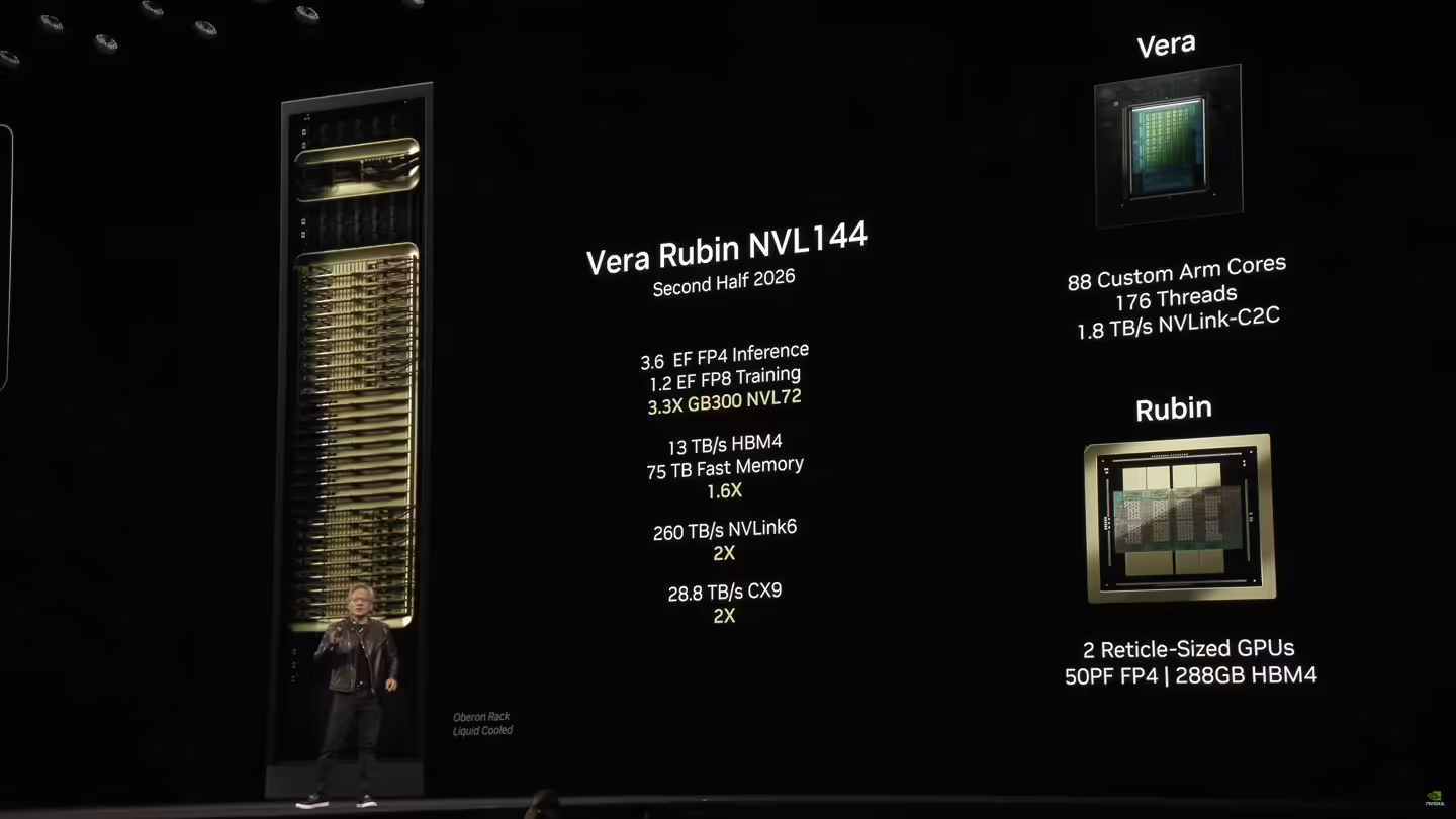 黄仁勋透露,由台积电代工的 Rubin GPU 首批样品已返回实验室测试,每颗 GPU 集成了 8 个 HBM4 接口和两颗与光罩尺寸相当的 GPU 核心芯片。与之搭配的 Vera CPU 则拥有 88 个定制 Arm 架构核心,最高支持 176 线程。