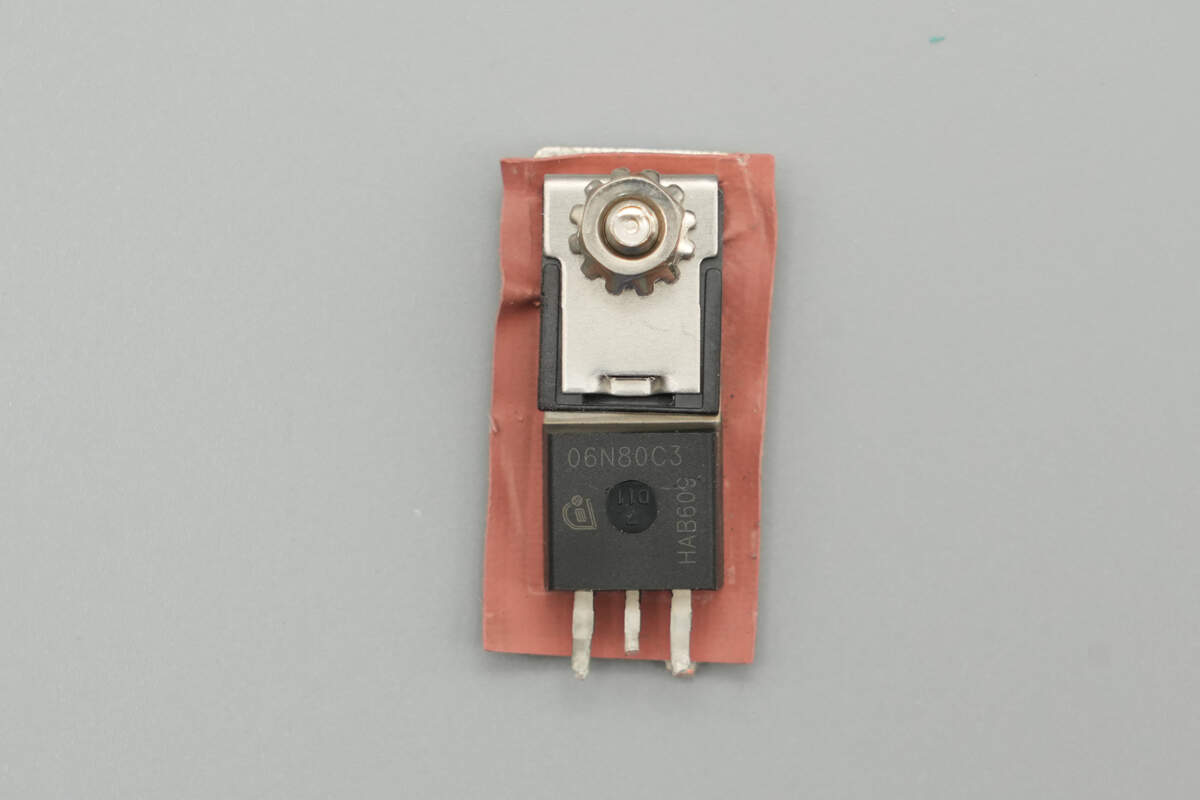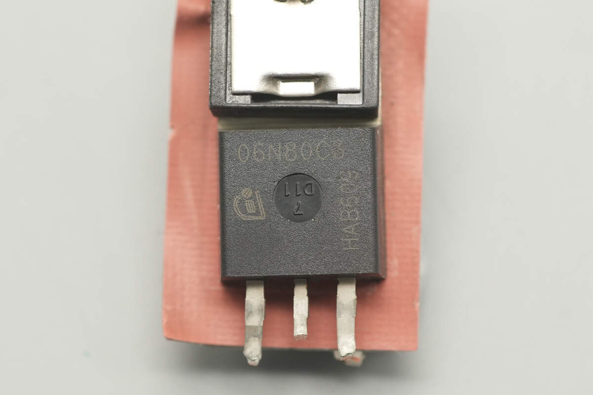开关管来自英飞凌,丝印06N80C3,型号SPA06N80C3,NMOS,耐压800V,导阻900mΩ,采用TO220-3封装。