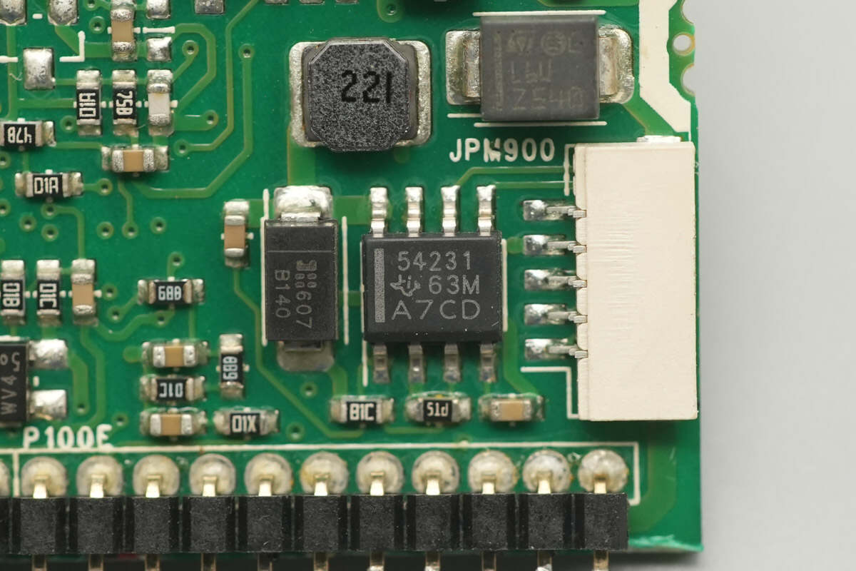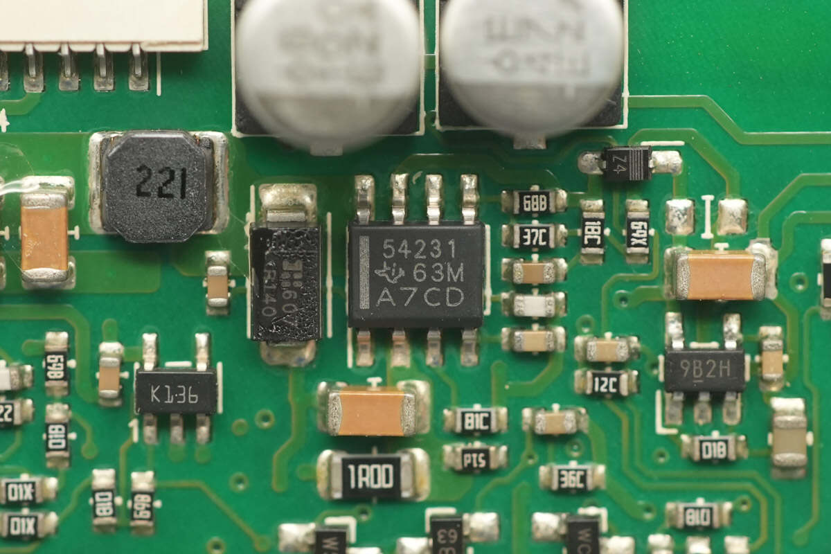 降压芯片来自德州仪器,型号TPS54231,支持3.5-28V输入电压,芯片内置开关管,输出电流2A,采用SOIC8封装。