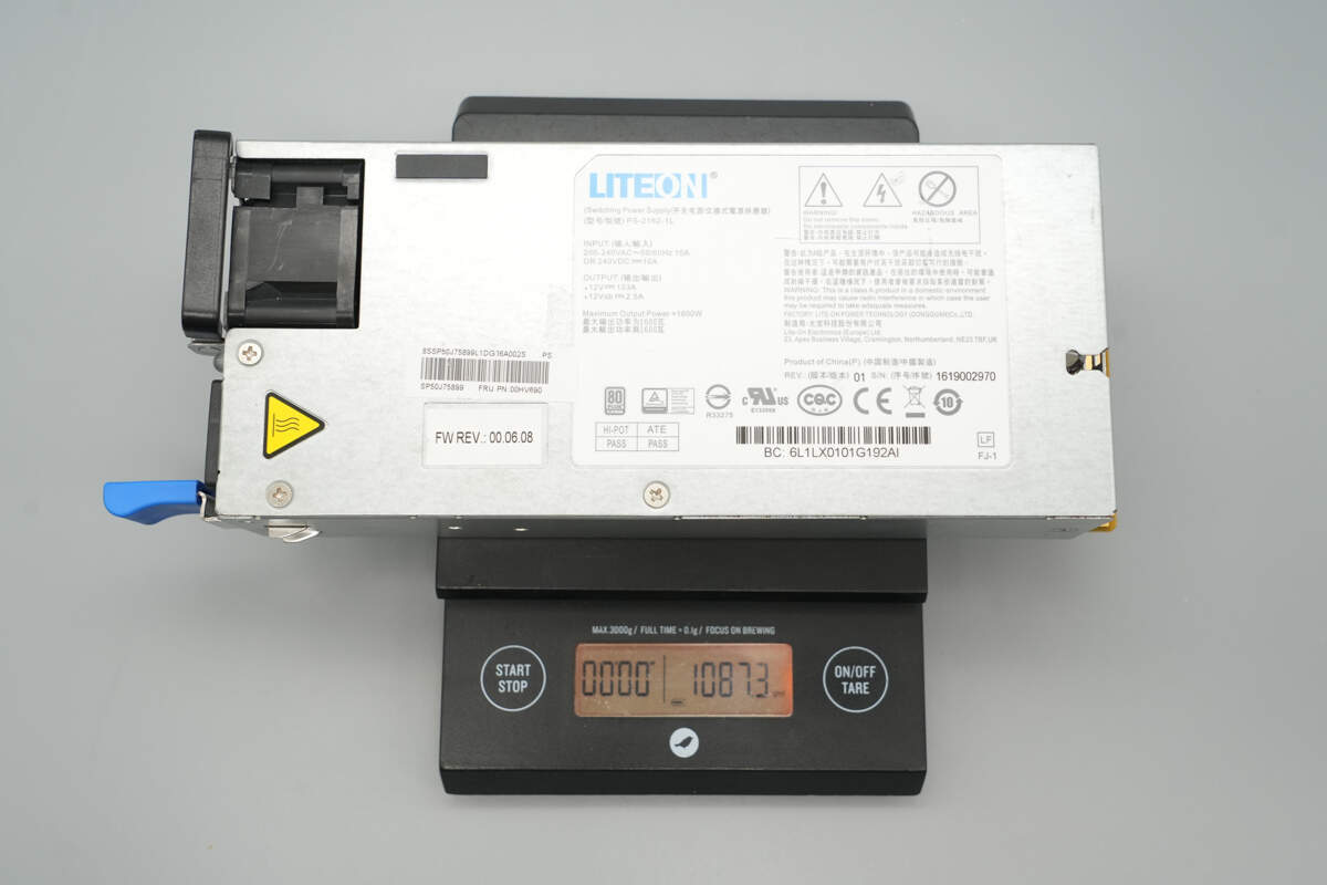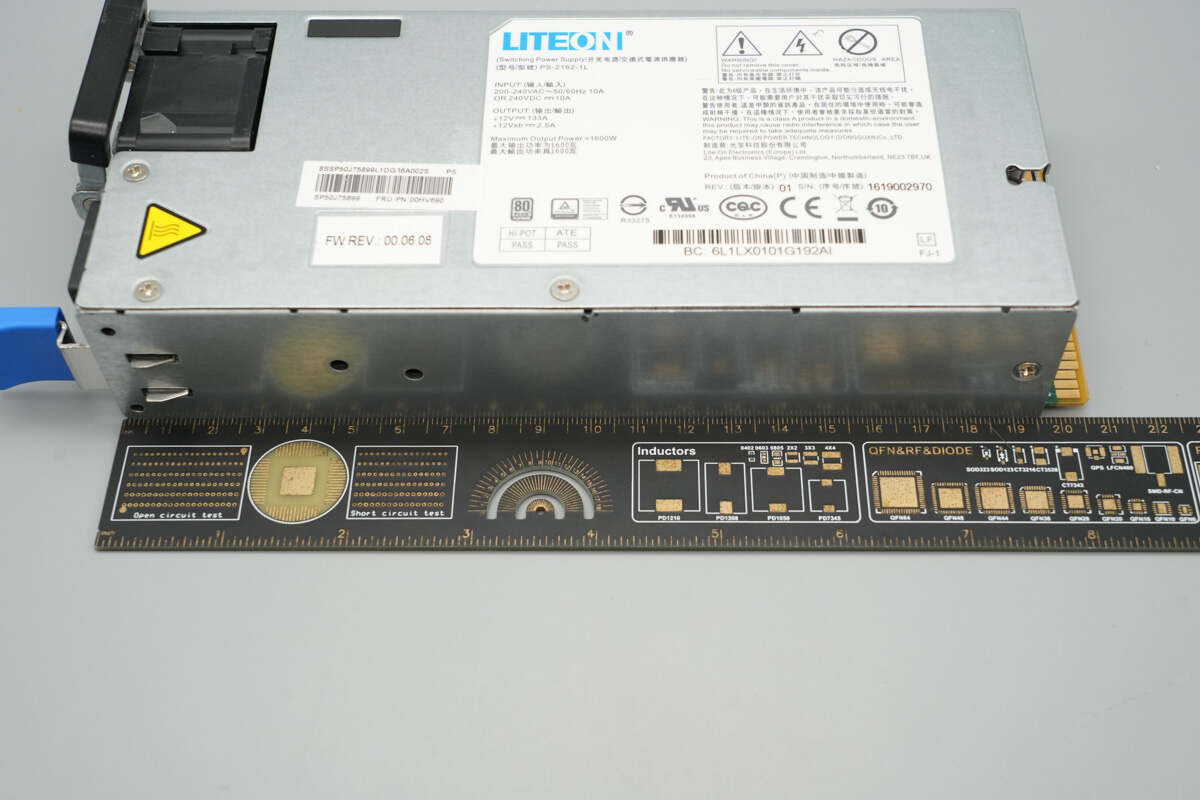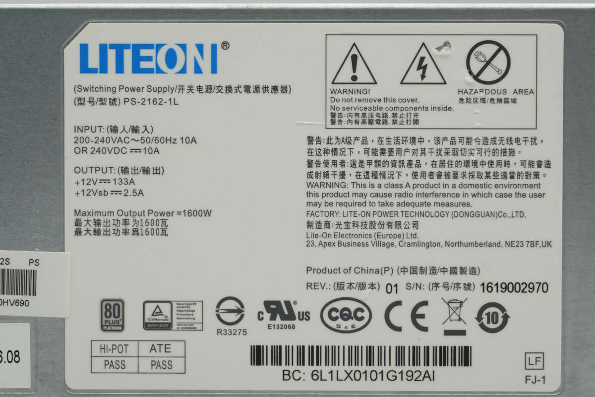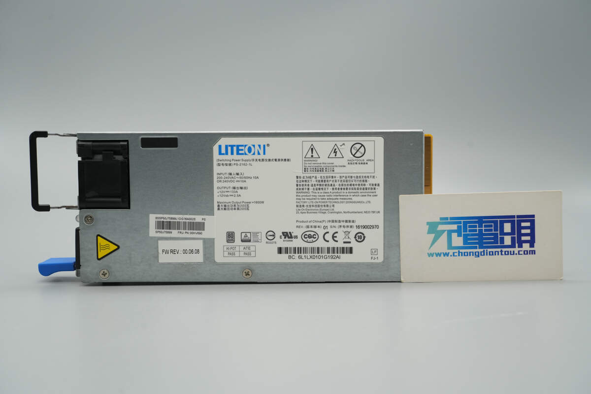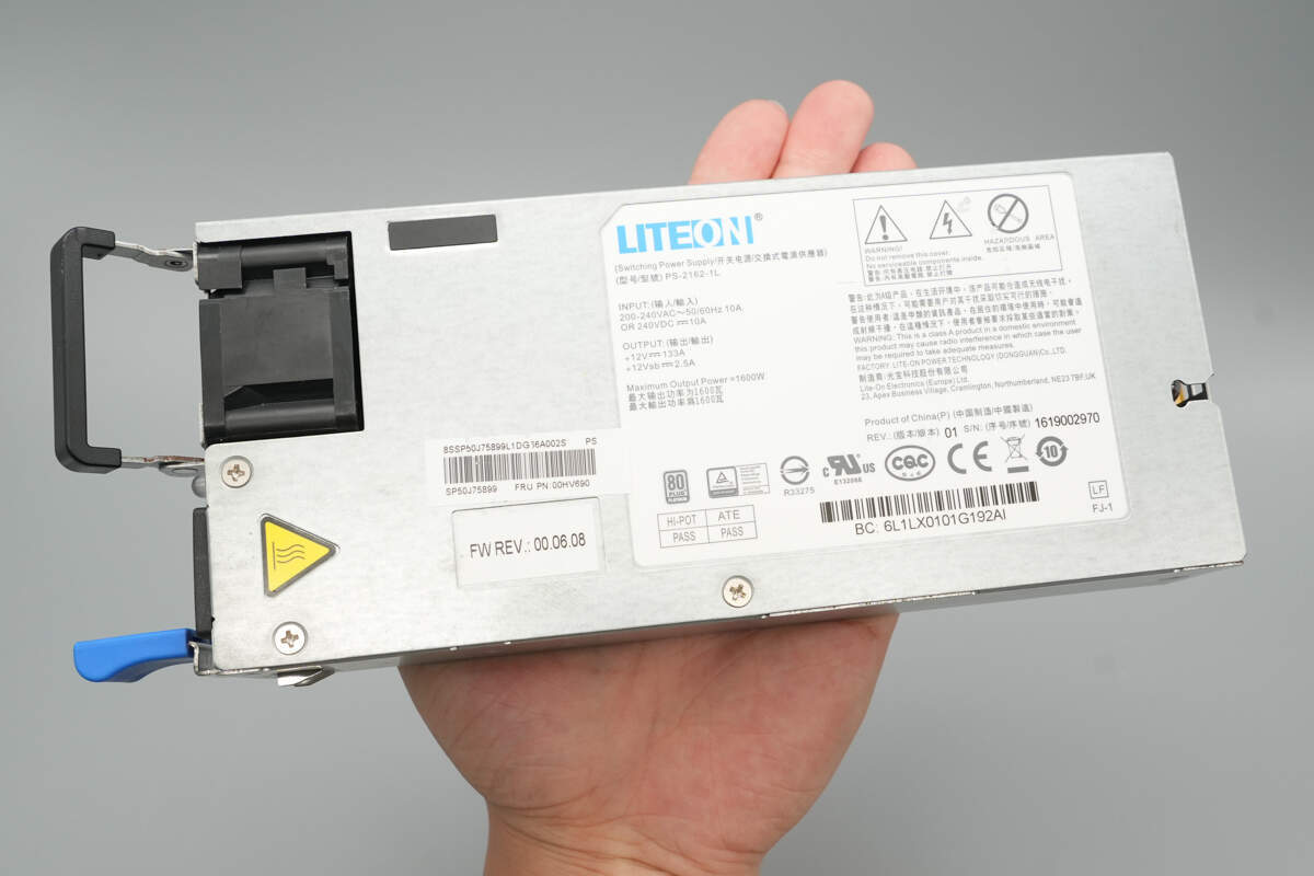 光宝1600W白金牌服务器电源采用金属外壳,通过螺丝固定,机身正面粘贴标签。