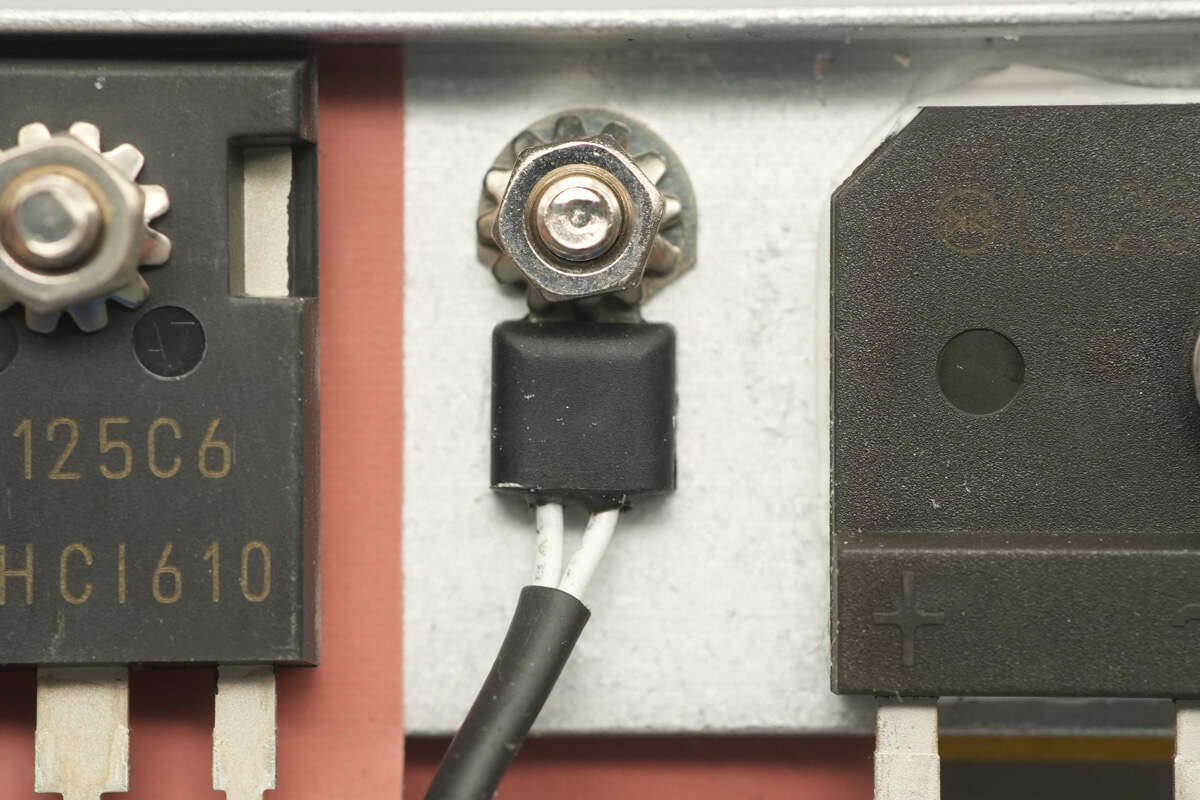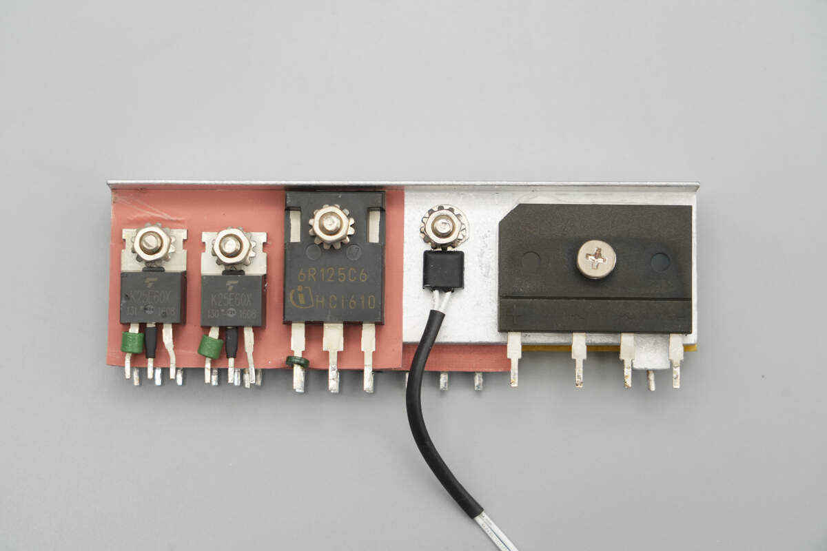 散热片一面设有移相全桥开关管,PFC开关管,热敏电阻和整流桥。