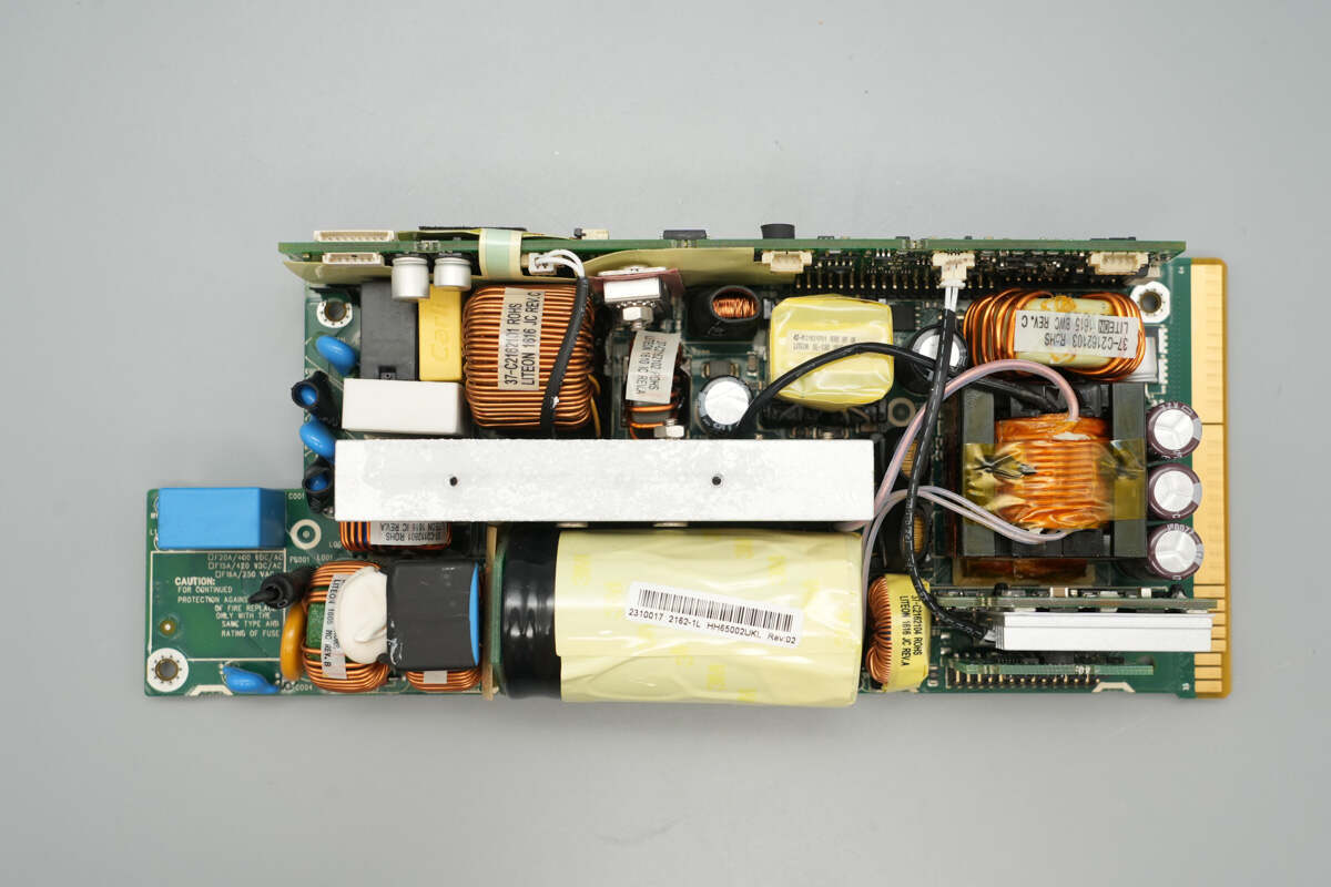 PCBA模块正面一览,左侧为交流输入端,设有保险丝,压敏电阻,安规X2电容,共模电感,继电器,启动电阻,PFC升压电感。中间位置设有散热片,为PFC开关管,PFC整流管和移相全桥开关管散热。