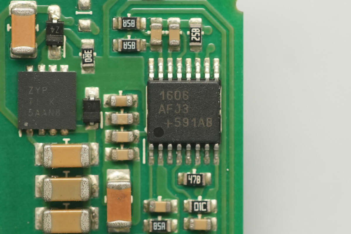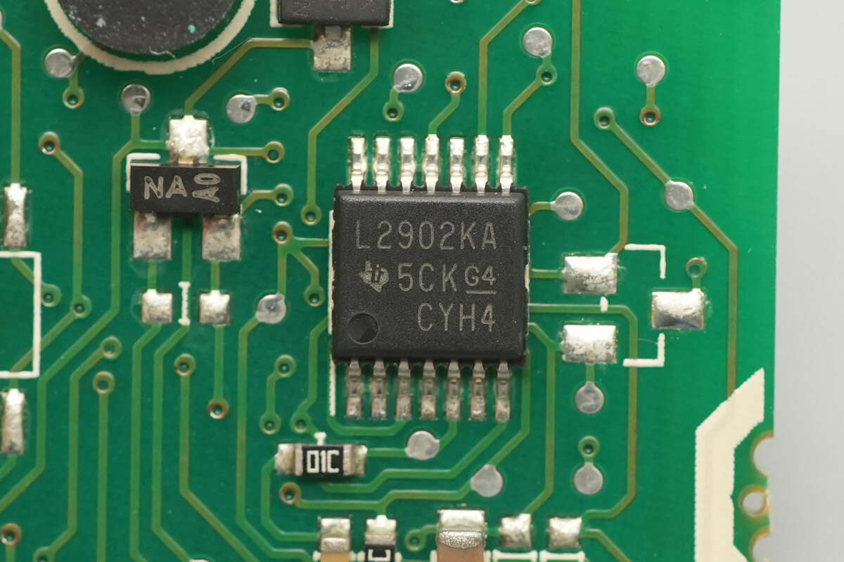 运放来自德州仪器,丝印L2902KA,型号LM2902KAV,为四通道运算放大器,具备2KV ESD,采用TSSOP14封装。