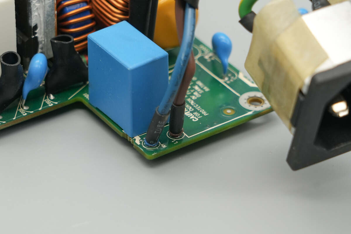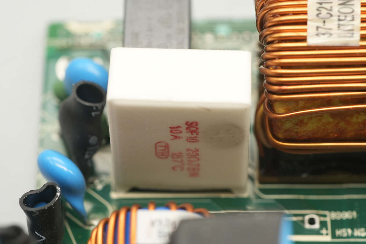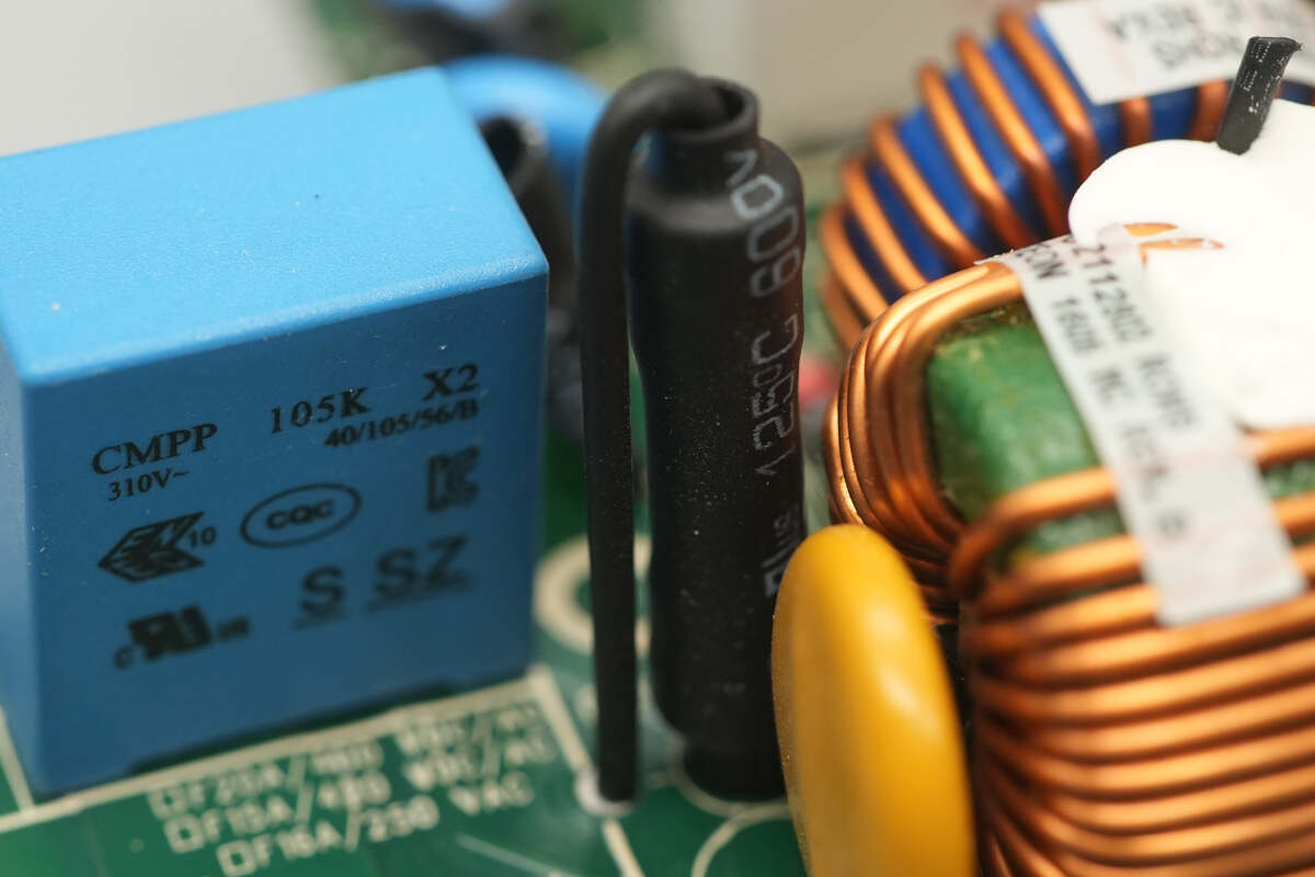 电源输入端设有保险丝,压敏电阻,共模电感,安规X2电容,滤波电感,继电器和启动电阻。