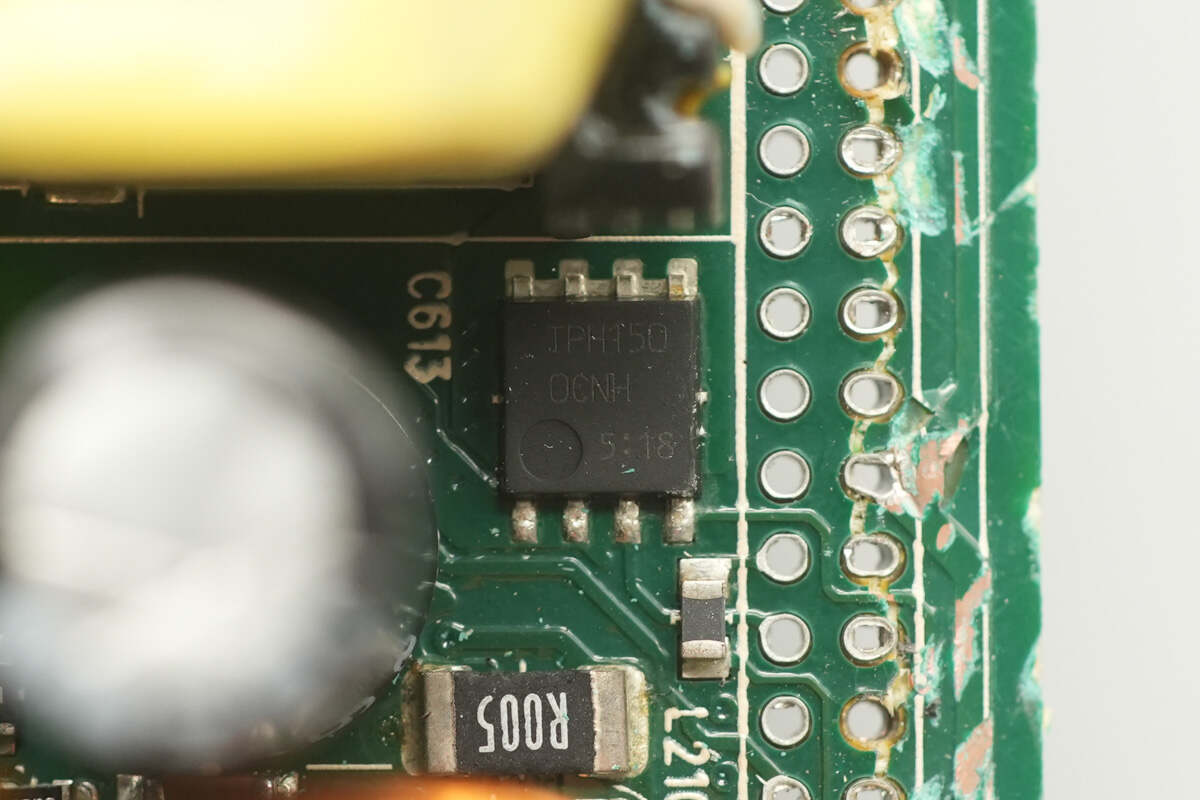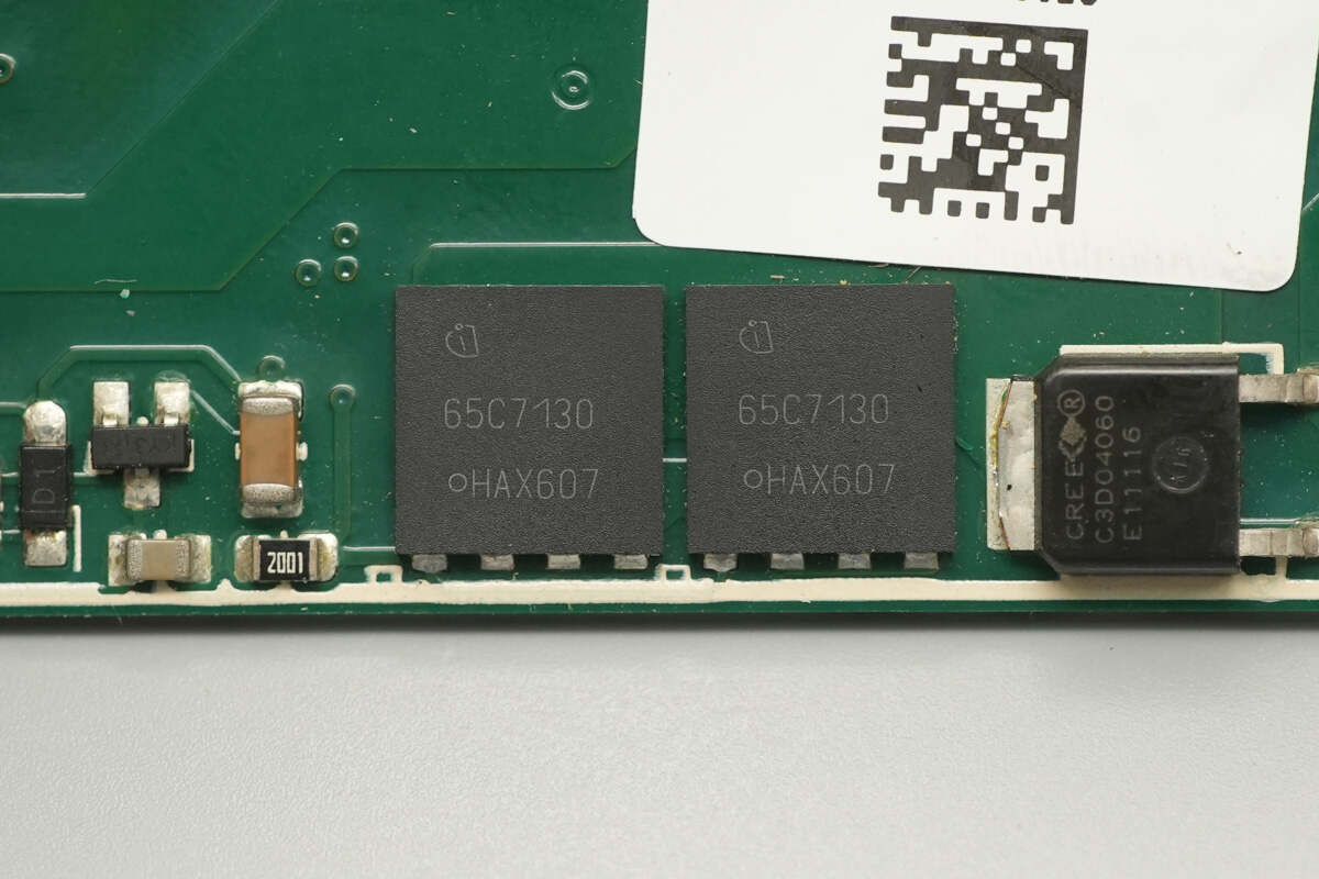两颗开关管来自英飞凌,丝印65C7130,型号IPL65R130C7,为CoolMOS C7系列,NMOS,耐压700V,导阻130mΩ,采用VSON-4封装。