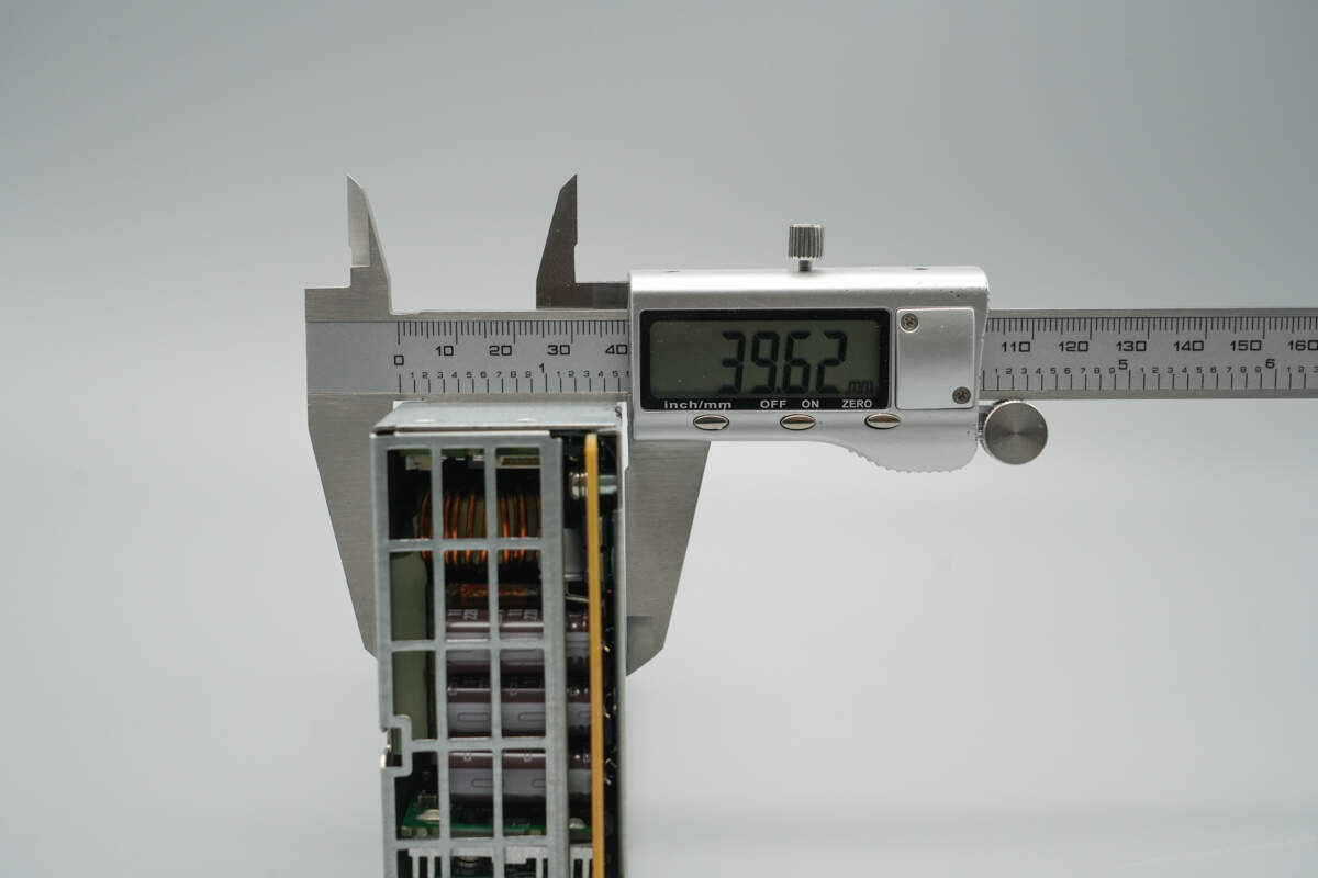 电源模块输出端设有格栅和金手指小板,透过格栅可以看到内部滤波电容。