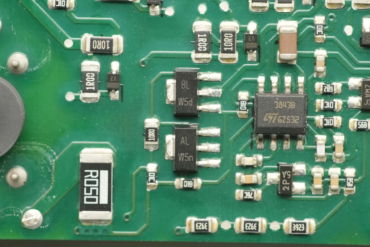 电源主控芯片来自意法半导体,型号UC3843B,是一颗高性能电流模式PWM控制器,内置大电流图腾柱驱动输出,采用SO8封装。