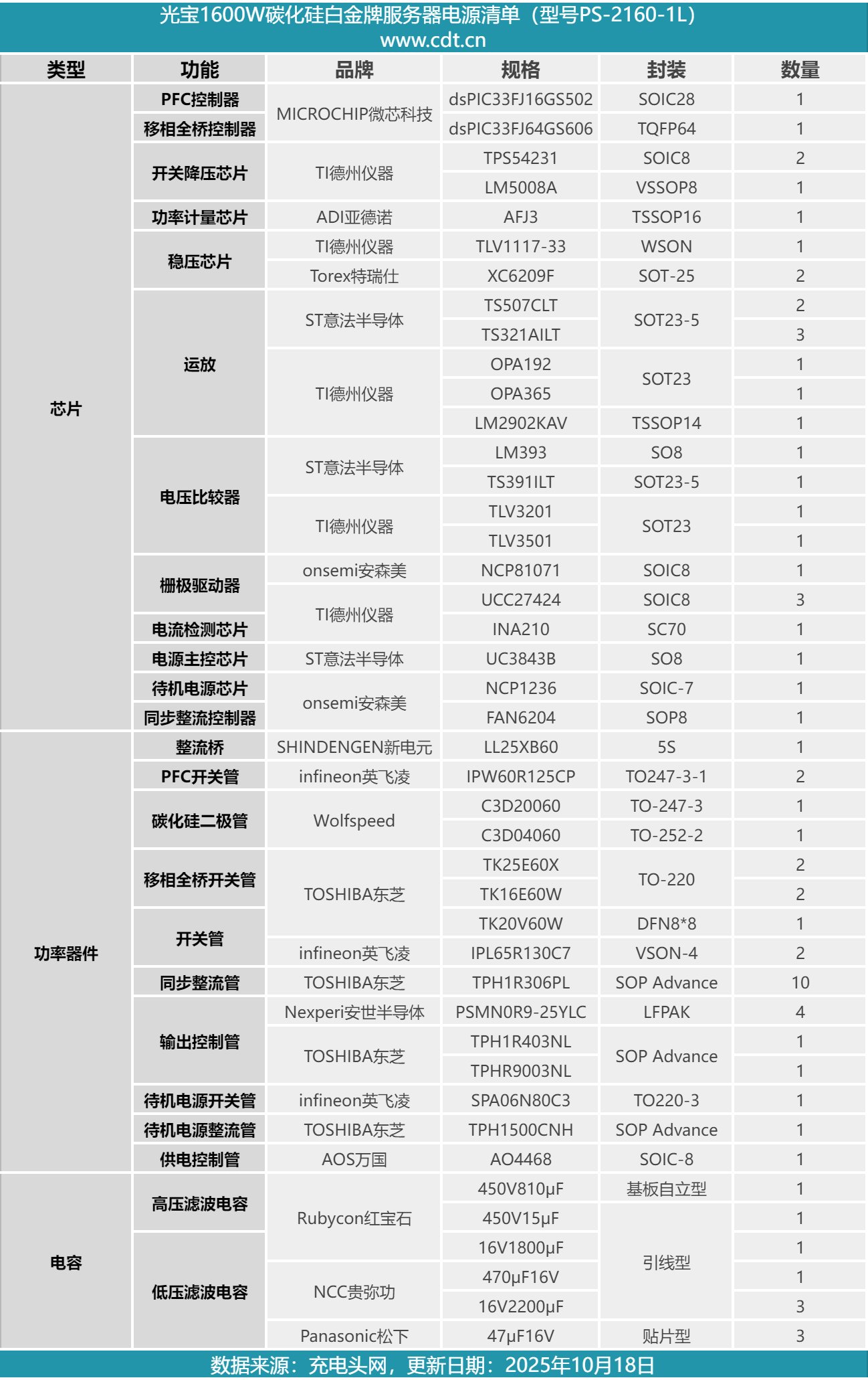 最后附上光宝这款1600W碳化硅白金牌服务器电源的核心器件清单,方便大家查阅。
