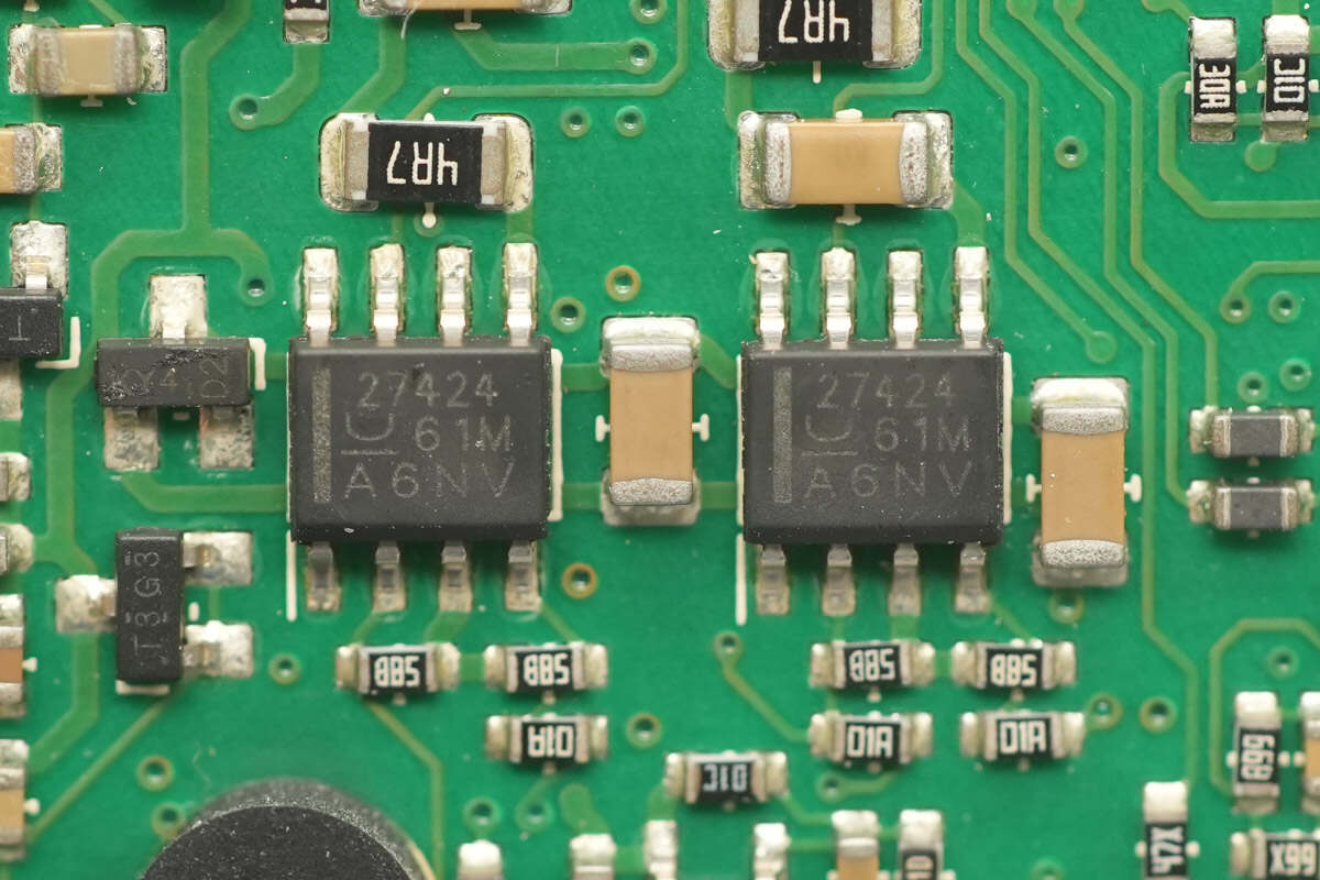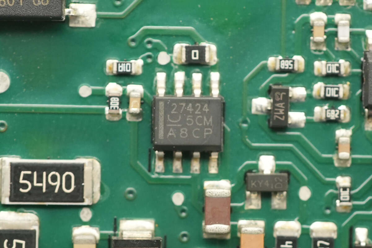 驱动器来自德州仪器,型号UCC27424,是一颗具有使能功能的4A双通道栅极驱动器,采用SOIC8封装。
