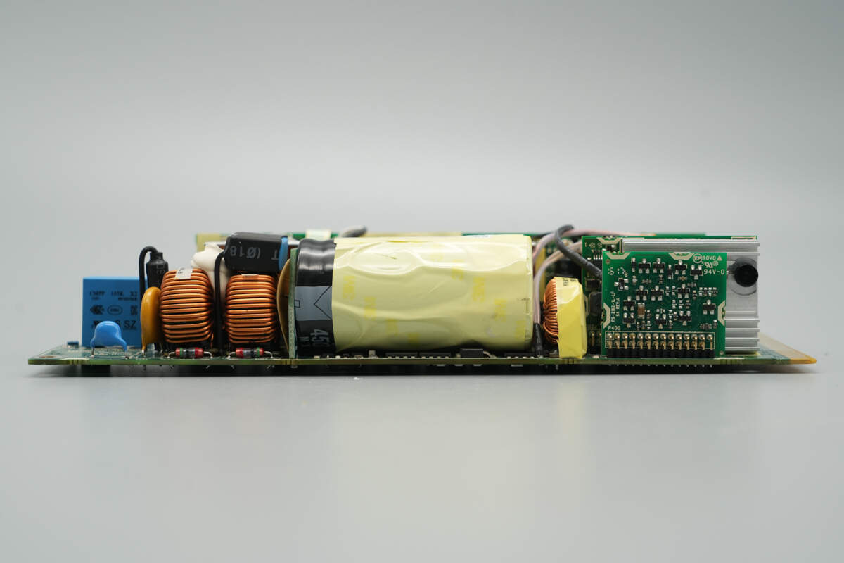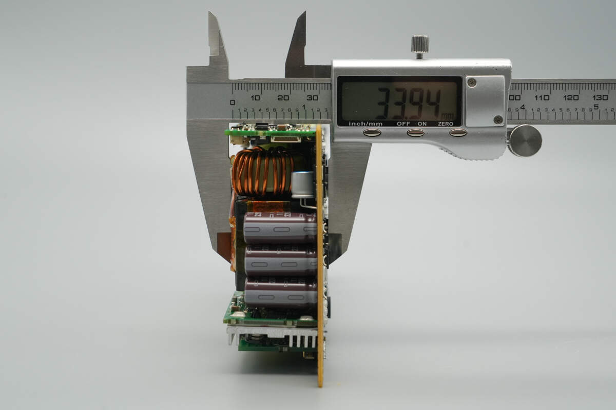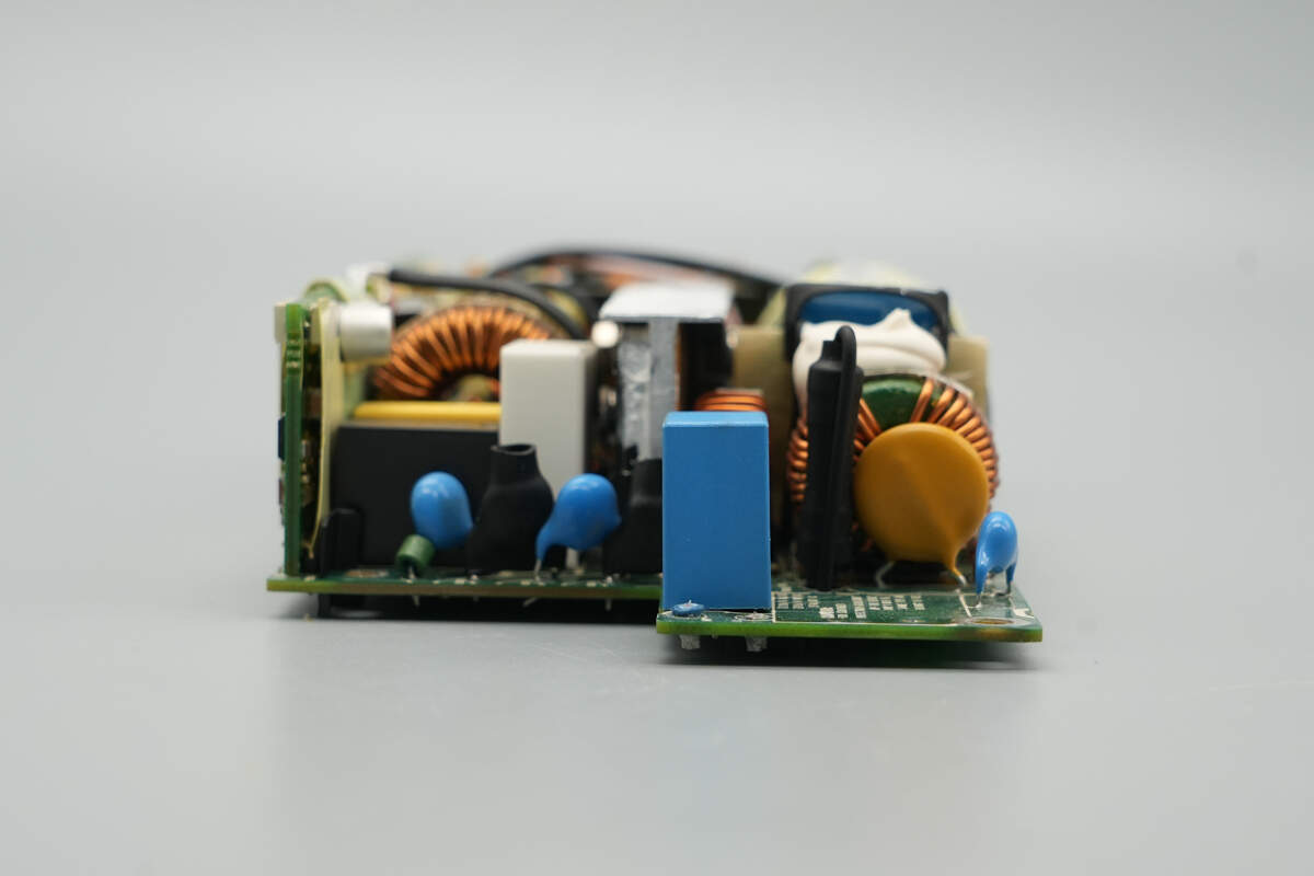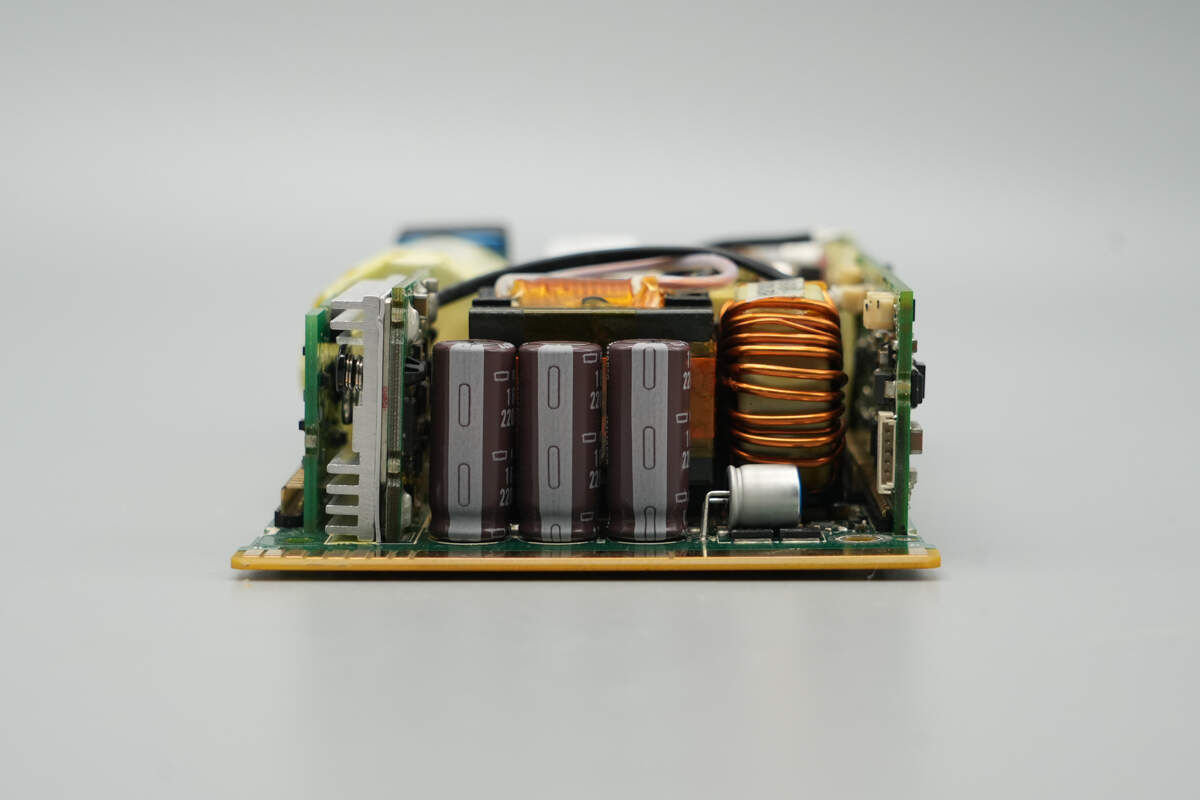 侧面设有高压滤波电容和滤波电感,右侧设有同步整流管小板。