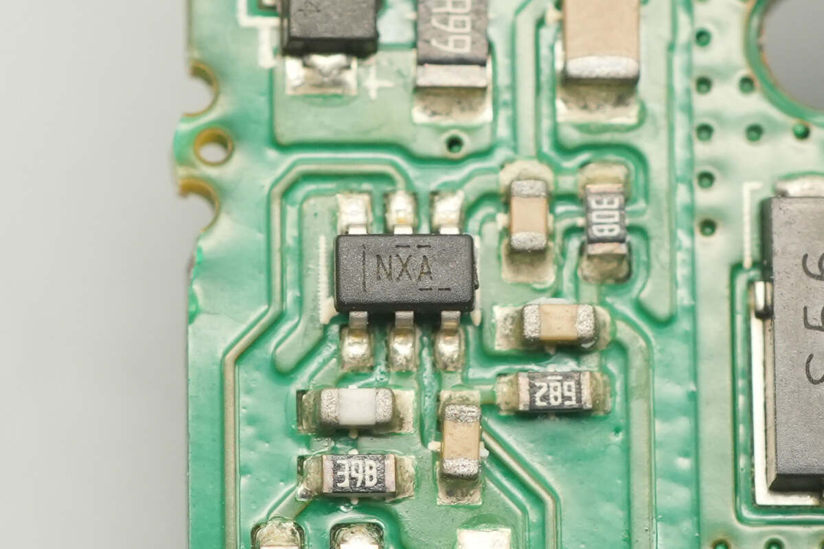 电压比较器来自德州仪器,丝印NXA,型号TLV3501,是一颗具有关断模式的轨到轨高速比较器,采用SOT23封装。