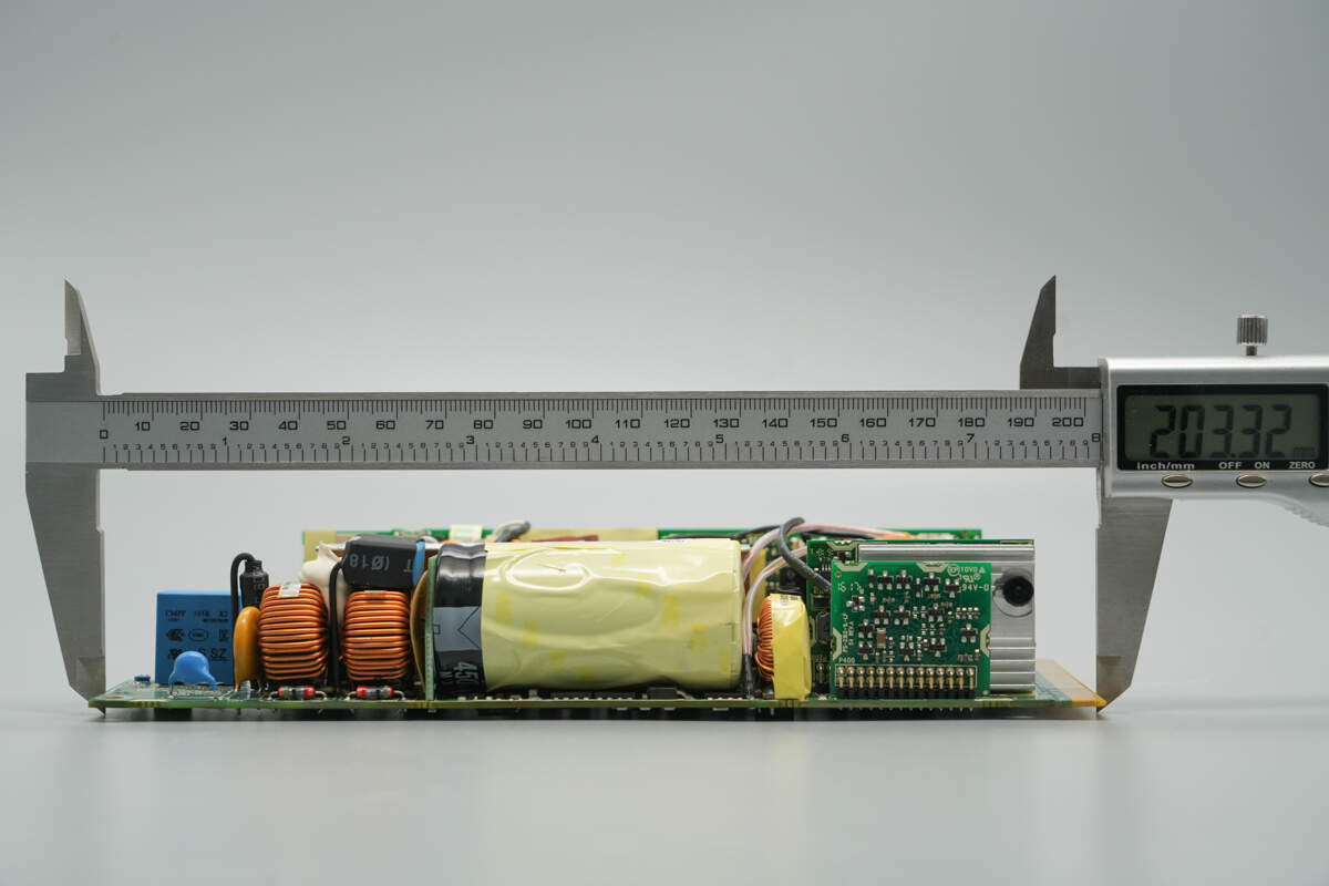 使用游标卡尺测得PCBA模块长度约为203.3mm。