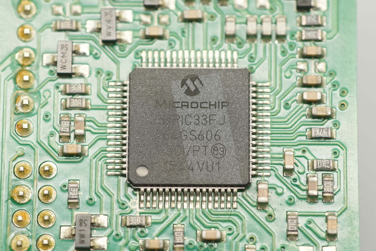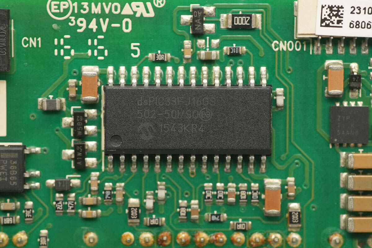 PFC控制器来自微芯科技,型号dsPIC33FJ16GS502,内置16位dsPIC33F CPU,主频为50MHz,内置16KB FLASH和2KB RAM,具备高速PWM输出,用于PFC升压控制,采用SOIC28封装。