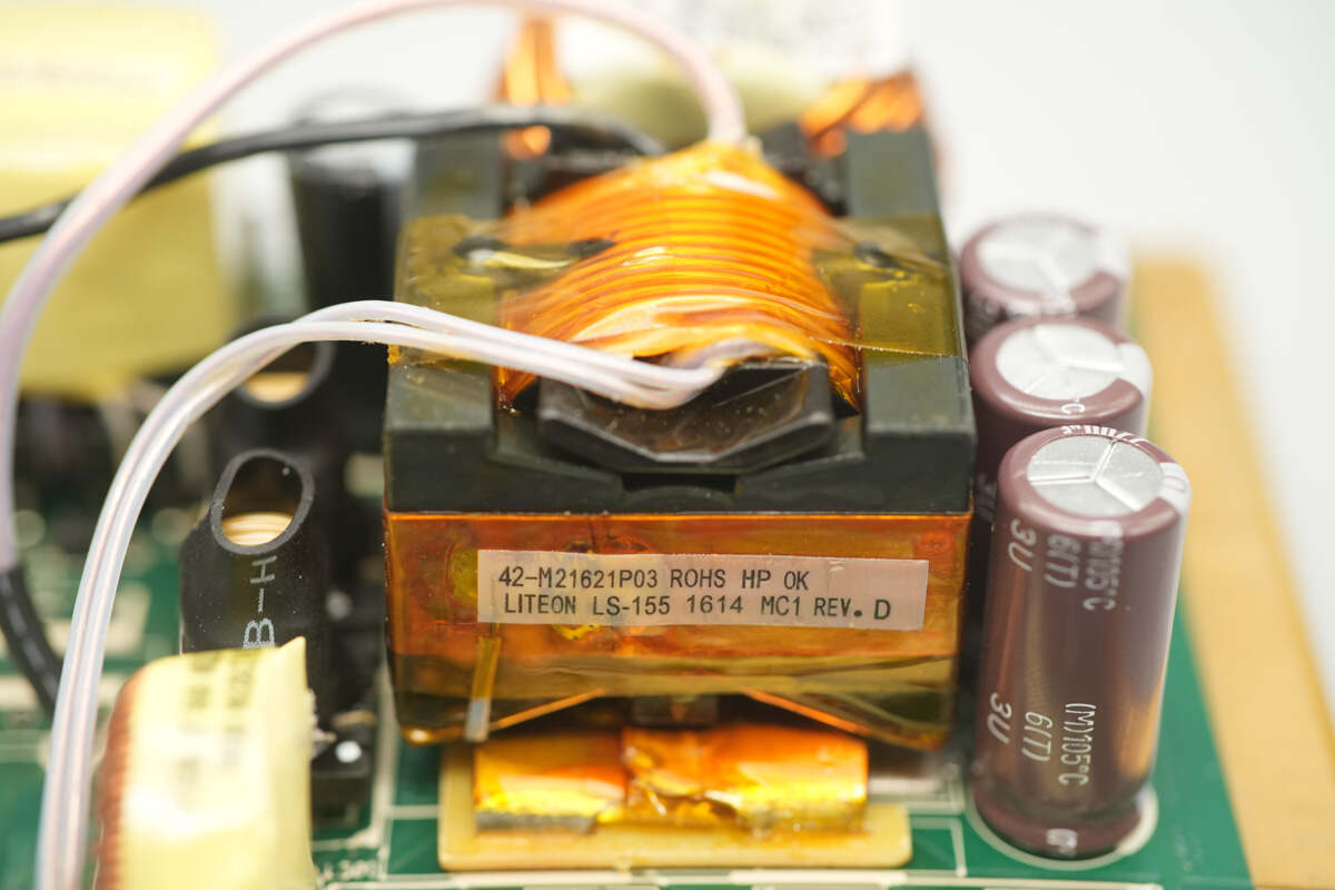 首先拧开固定螺丝,拆开电源外壳,壳体内部设有透明麦拉片绝缘,变压器与壳体之间设有导热垫散热。