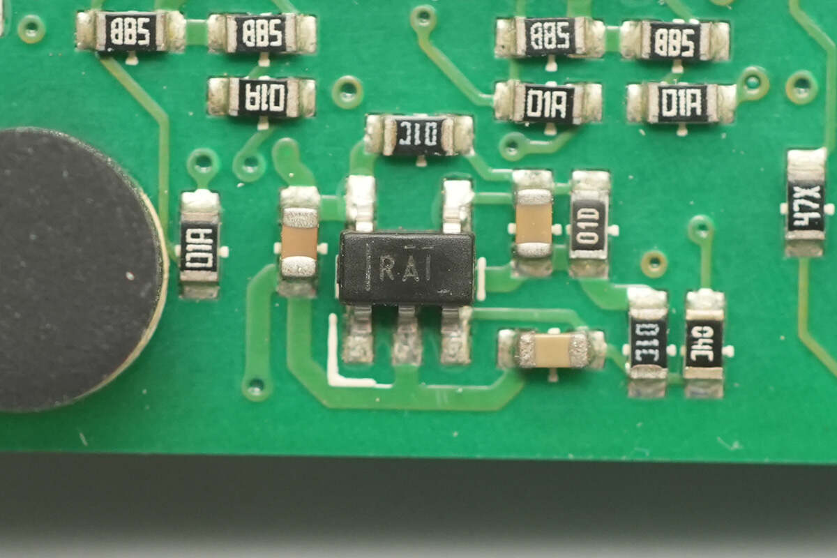 电压比较器来自德州仪器,丝印RAI,型号TLV3201,为高速单路推挽比较器,采用SOT23封装。