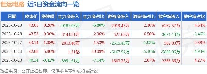 证券之星消息,截至2025年10月29日收盘,世运电路(603920)报收于43.65元,上涨0.28%,换手率4.32%,成交量31.11万手,成交额13.51亿元。