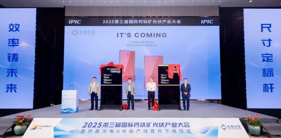 10月29日,“2025第三届国际钙钛矿光伏产业大会”暨首片组件下线仪式在江苏昆山开幕。会上,协鑫光电GW级钙钛矿产线首片2400mm×1150mm全尺寸钙钛矿组件正式面世。协鑫光电方面称,这是全球钙钛矿领域尺寸最大的量产商业化产品。